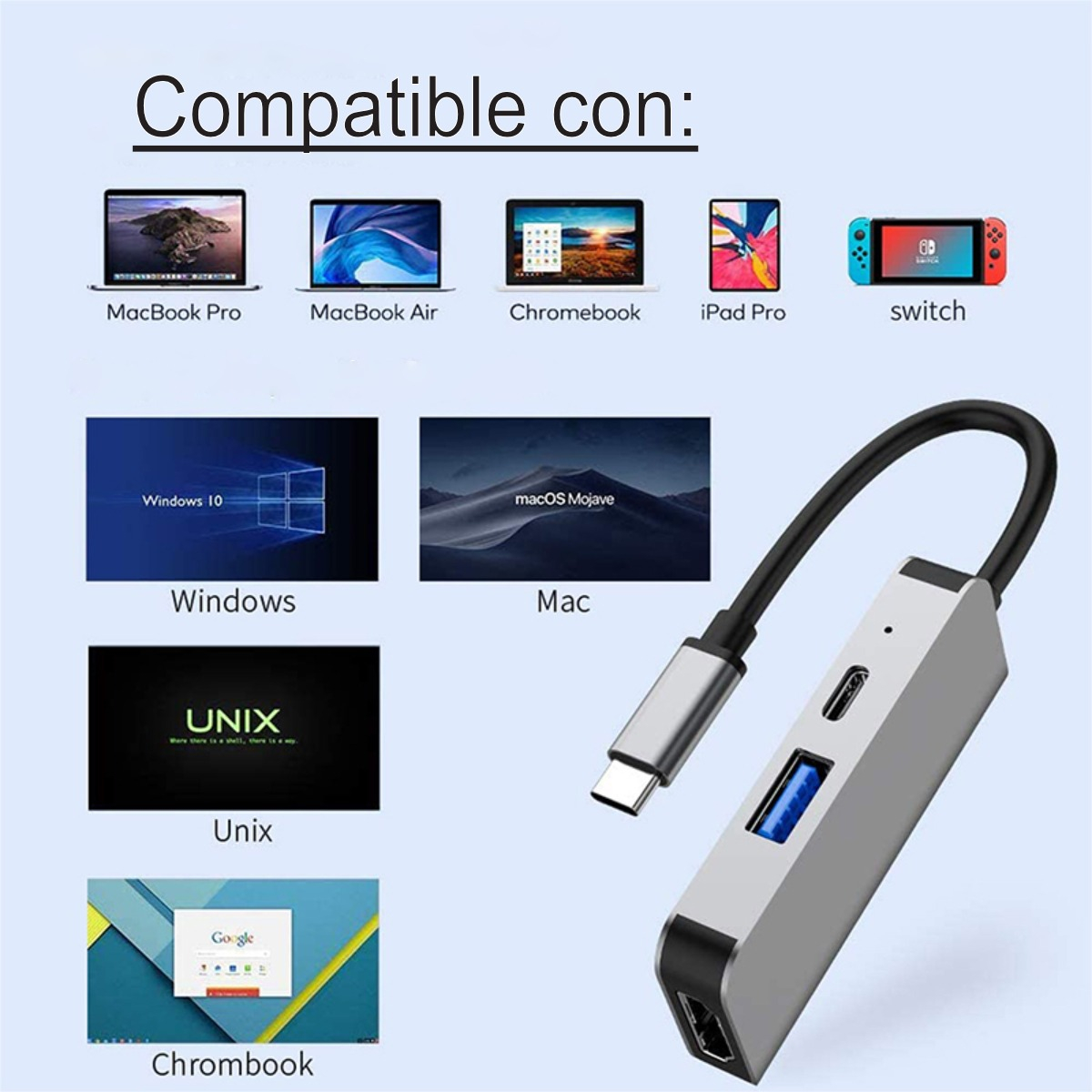 Hub USB 3.0 con 3 puertos tipo c a 4k, HDMI, PD USB-A de carga 3.0, puerto de datos 3 en 1, extensor divisor USB.