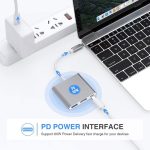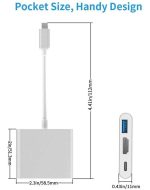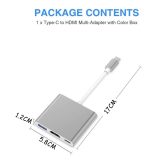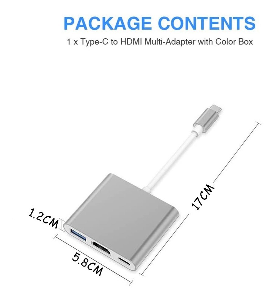>> Compatible con Mac OS Chrome OS y Windows 10 >> No compatible con celulares (puede funcionar en algunos dispositivos) >> Interfaz USB 3,1 (Gen 2) tipo C con tasa de transferencia de datos de hasta 10 Gbps >> Fácil operación: plug and play, no se necesita un controlador >> Adaptador de carcasa de metal de aluminio >> Admite resoluciones de hasta una apertura total 4 K/2160 p (4 K) ultra HD >> Longitud del Cable: aprox. 3,6 «(91,5mm) (aproximadamente 10 cm) >> Tamaño de la Caja: aprox. 2,4 «x 2,0» x 0,5 «(60,0*50,0*11,5mm) >> Tres puertos de salida: -Puerto de salida hembra estándar USB 3,0 tipo A -Puerto de salida HDMI hembra -Puerto de carga hembra USB-C (el puerto de carga no admite transferencia de datos, salida AV, salida de carga y adaptador de extensión) >> Color: Gris, Plata