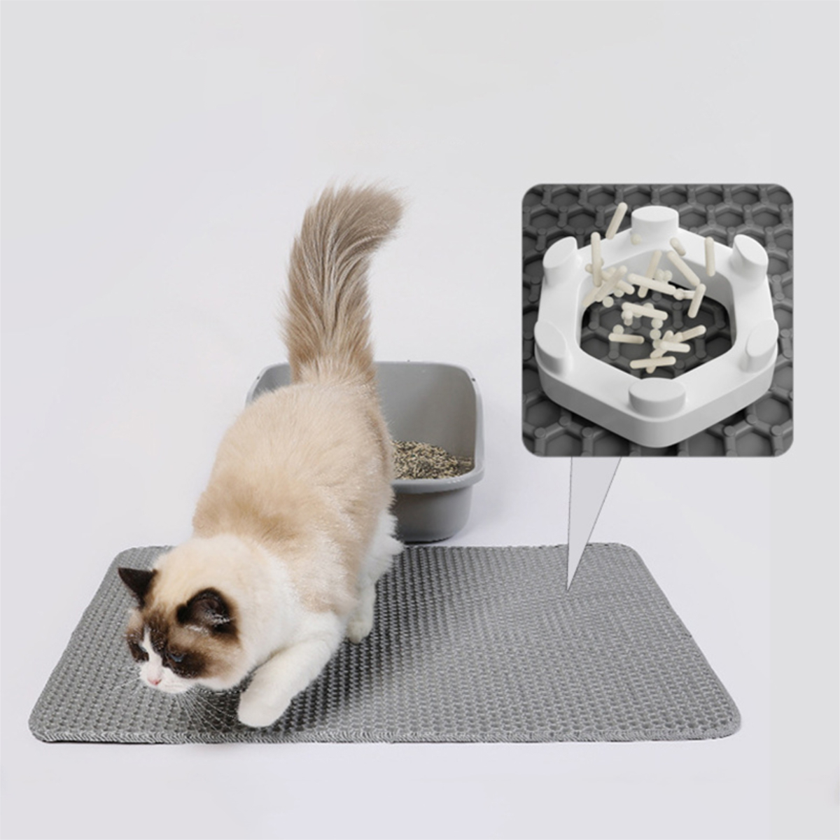 Diseño doble capa: La capa superior de nuestra alfombra cuenta con un ingenioso diseño de panal que permite que la arena de las patas de tu gato se filtre y se aloje en la capa interior de la alfombra. Con nuestra alfombra sanitaria, la arena se mantiene contenida y no se dispersa, asegurando una limpieza total y eliminando cualquier rastro no deseado.
