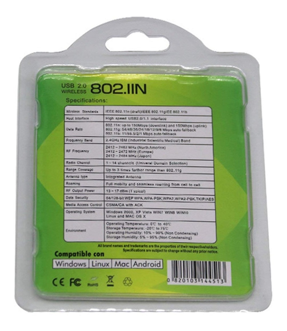 CARACTERÍSTICAS DEL PRODUCTO : Adaptador USB de norma 802.11n con velocidad de hasta 3000Mbps. Diseño ultra compacto (nano) ideal para viaje o para espacios reducidos. Solo 3*1 cm de tamaño. Compatible con dispostivos de normas anteriores 802.11b/g. Protege su comunicación inalámbrica a través de protocolos de seguridad WEP, WPA y WPA2. Soporta modo de trabajo dual Ad-Hoc (Client-Client) e Infrastructure (AP-Client).