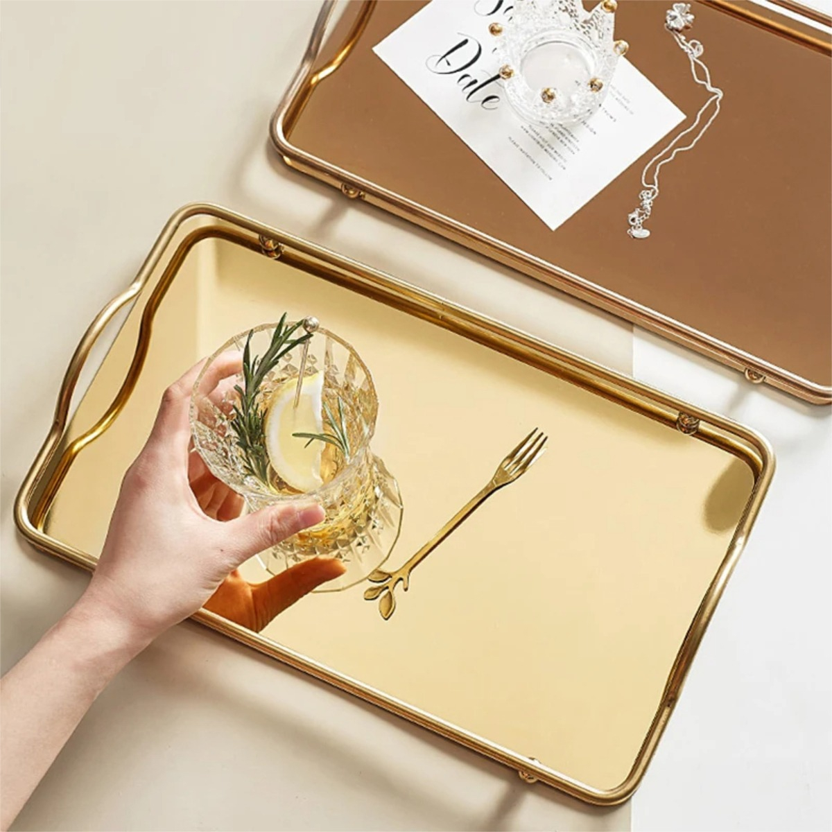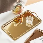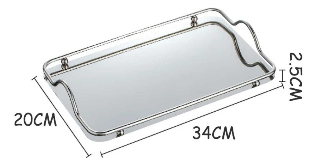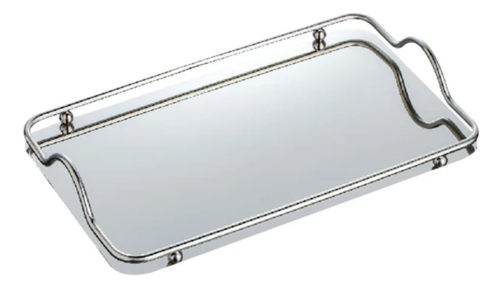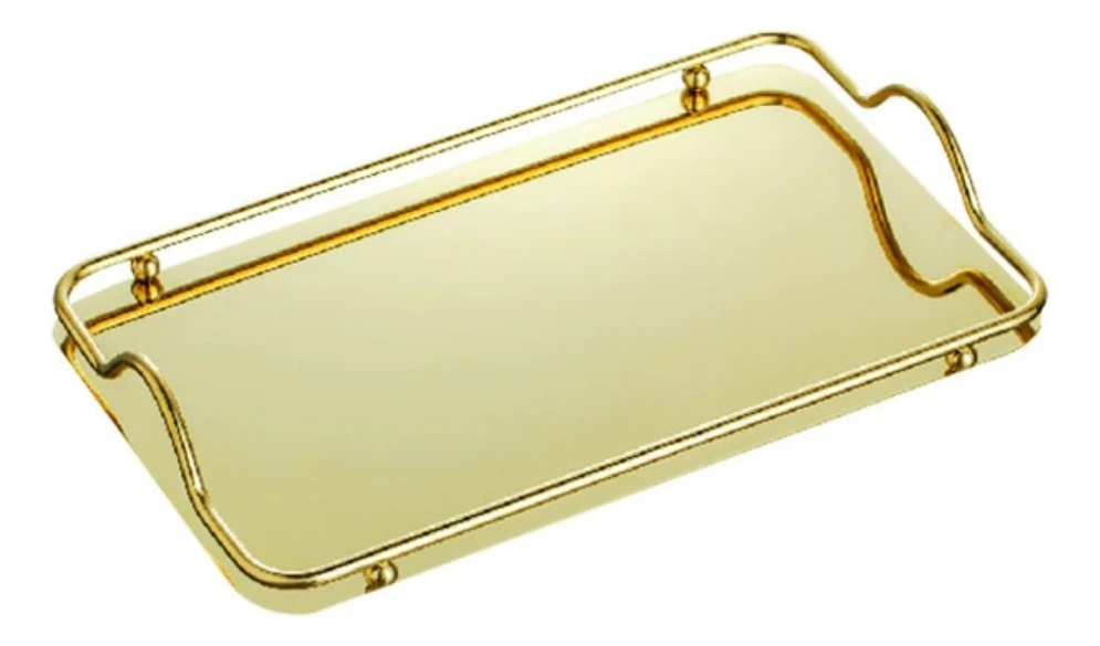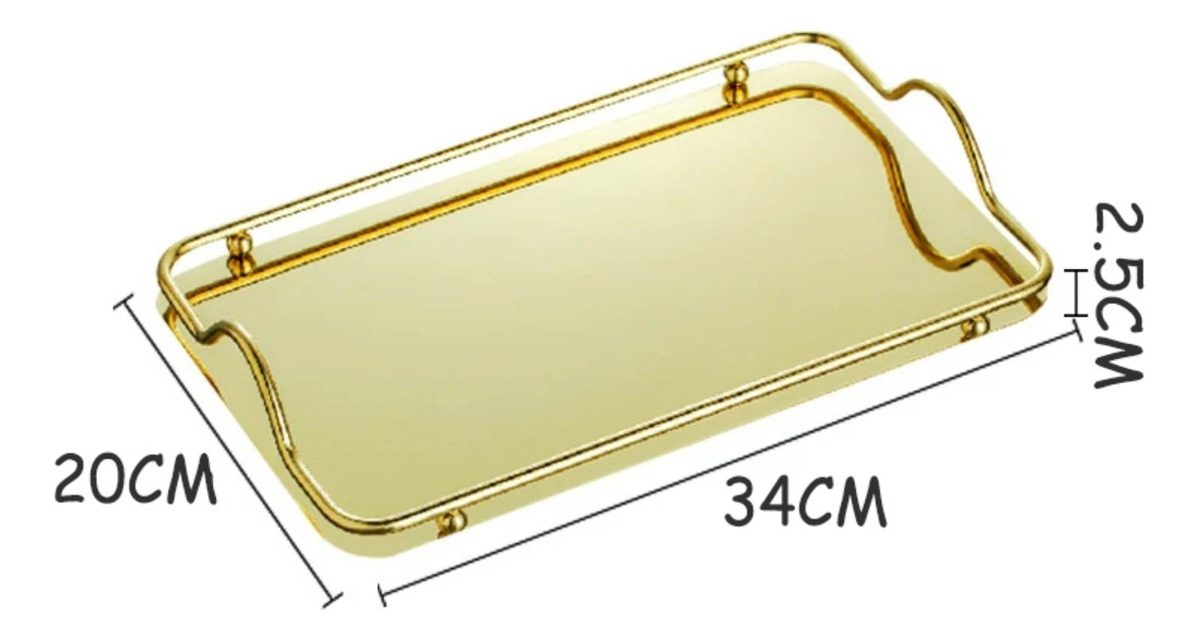 Practica y elegante bandeja metálica espejada, ideal para decoración, como centro de mesa o para uso al servir té, café o desayunos.