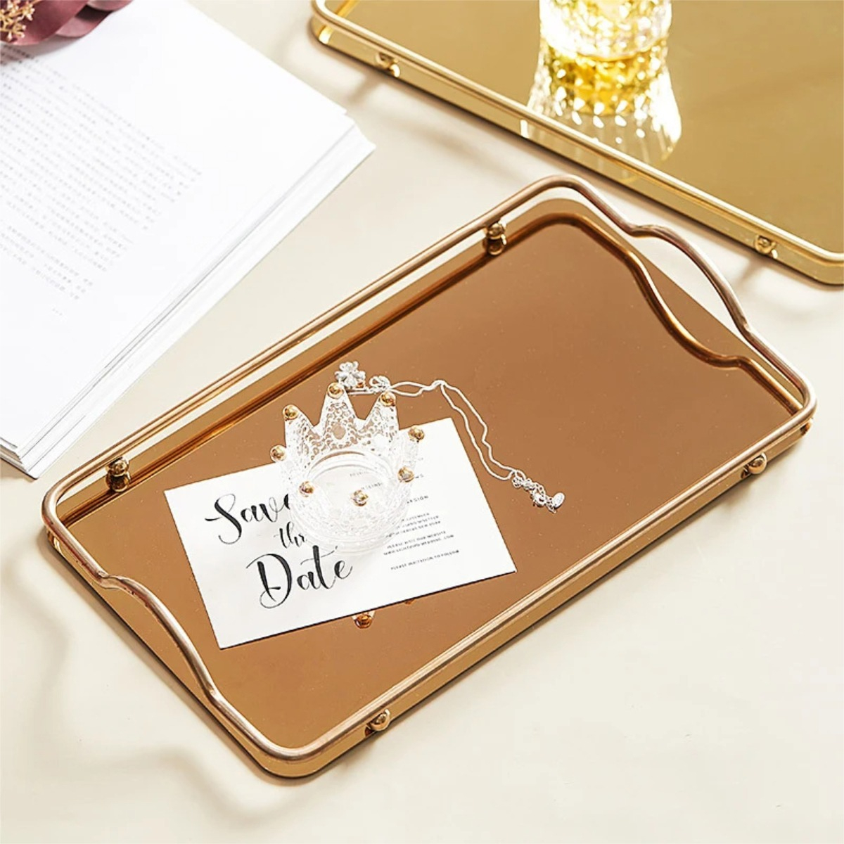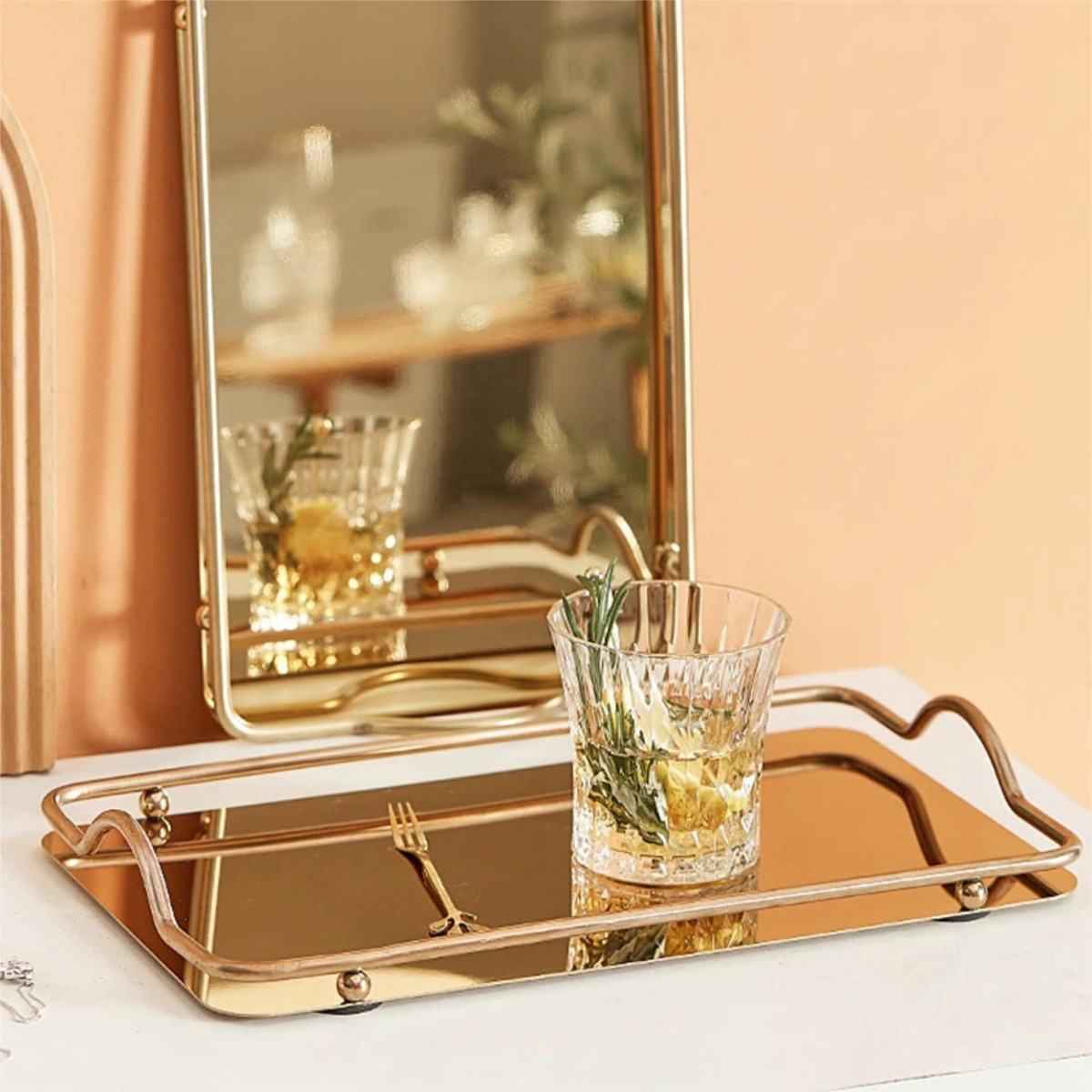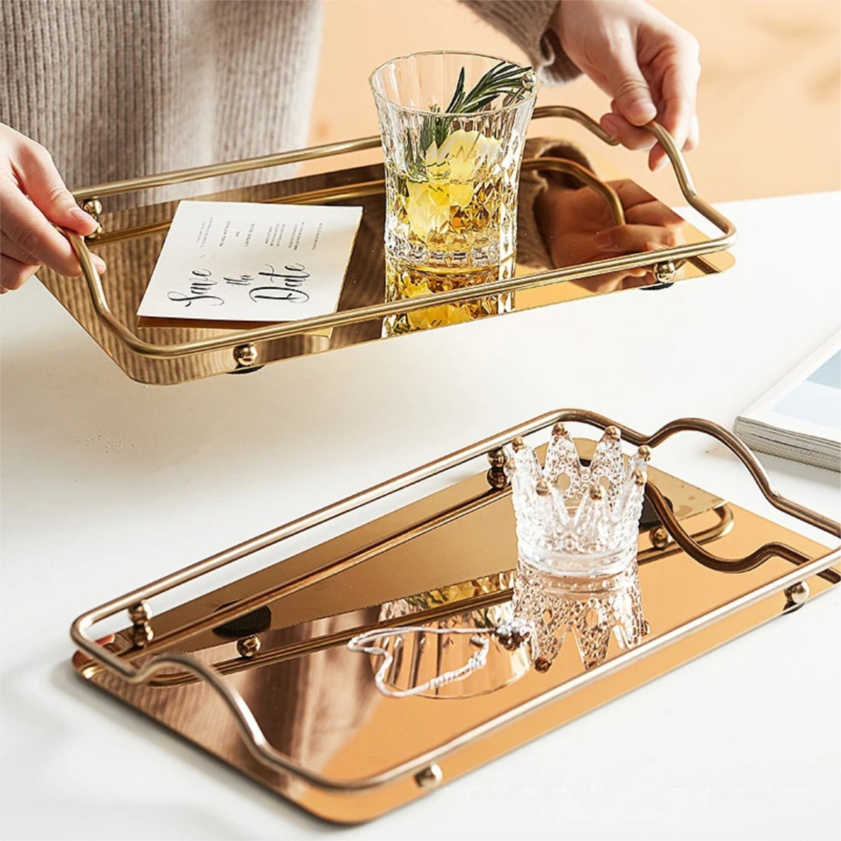 Practica y elegante bandeja metálica espejada, ideal para decoración, como centro de mesa o para uso al servir té, café o desayunos.