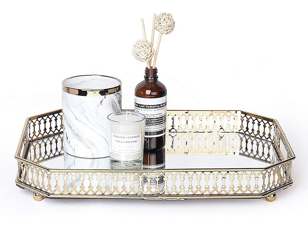 Bandeja con forma octagonal nórdica dorada y espejada. La base original del espejo es ideal para la exhibición del maquillaje de moda. Adopta hierro duradero y vidrio delicado. Muy buena calidad. Adecuado para almacenar frutas, cosméticos, postres, etc.