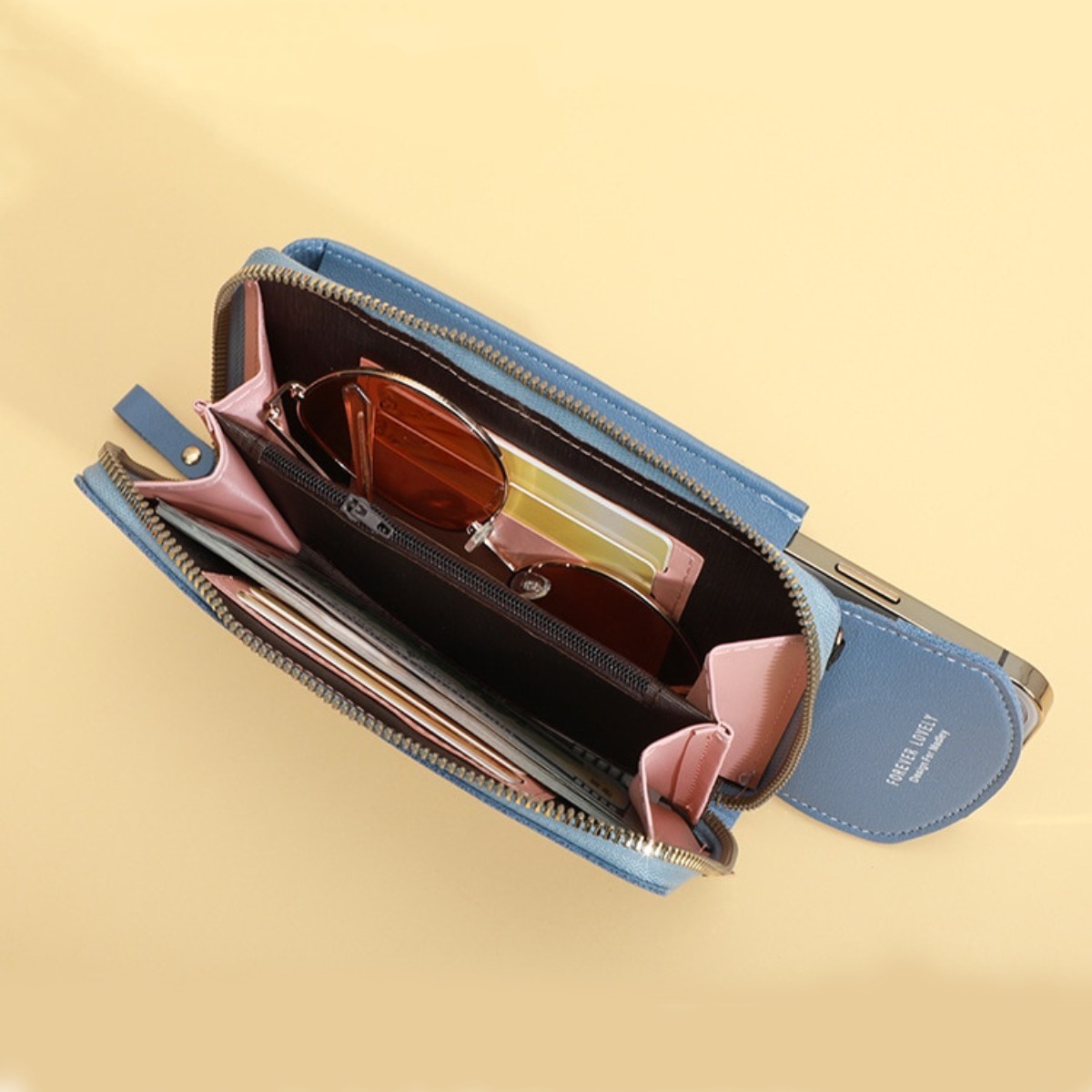 Billetera Portacelular estilo bandolera para dama, tiene espacio para billetes y papeles, así como un monedero con cierre y ranuras para 4 tarjetas. En la parte exterior tiene un bolsillo con solapa y botón a presión que sirve para guardar el celular, papeles etc. Incluye correa para usar como bandolera.