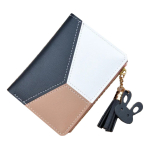 Billetera de dama con diseño geométrico en cuero PU, cuenta con capacidad para 5 tarjetas y un documento. Incluye una solapa para guardar papeles o billetes doblados y un bolsillo monedero con cierre. Ideal para organizar tus pertenencias con estilo y practicidad.