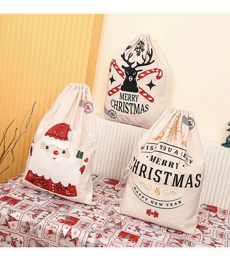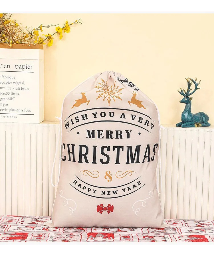 Bolsa navideña para guardar los regalos que deja papá noel. La bolsa Cuenta con un cordón para cerrarla y ajustarla. Mide 39cm de ancho x 60 cm de altura aproximadamente Disponemos de dos diseños. Coloca esta bolsa al pie de tu árbol y quedara original y hermoso.