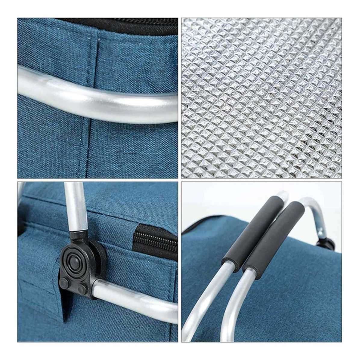 Material: tela Oxford + algodón perlado + película de aluminio Material del mango: marco de aluminio + mango acolchado suave Tamaño: aproximadamente 38X24X21cm (largo/alto/ancho) Capacidad: 18 lts aproximadamente