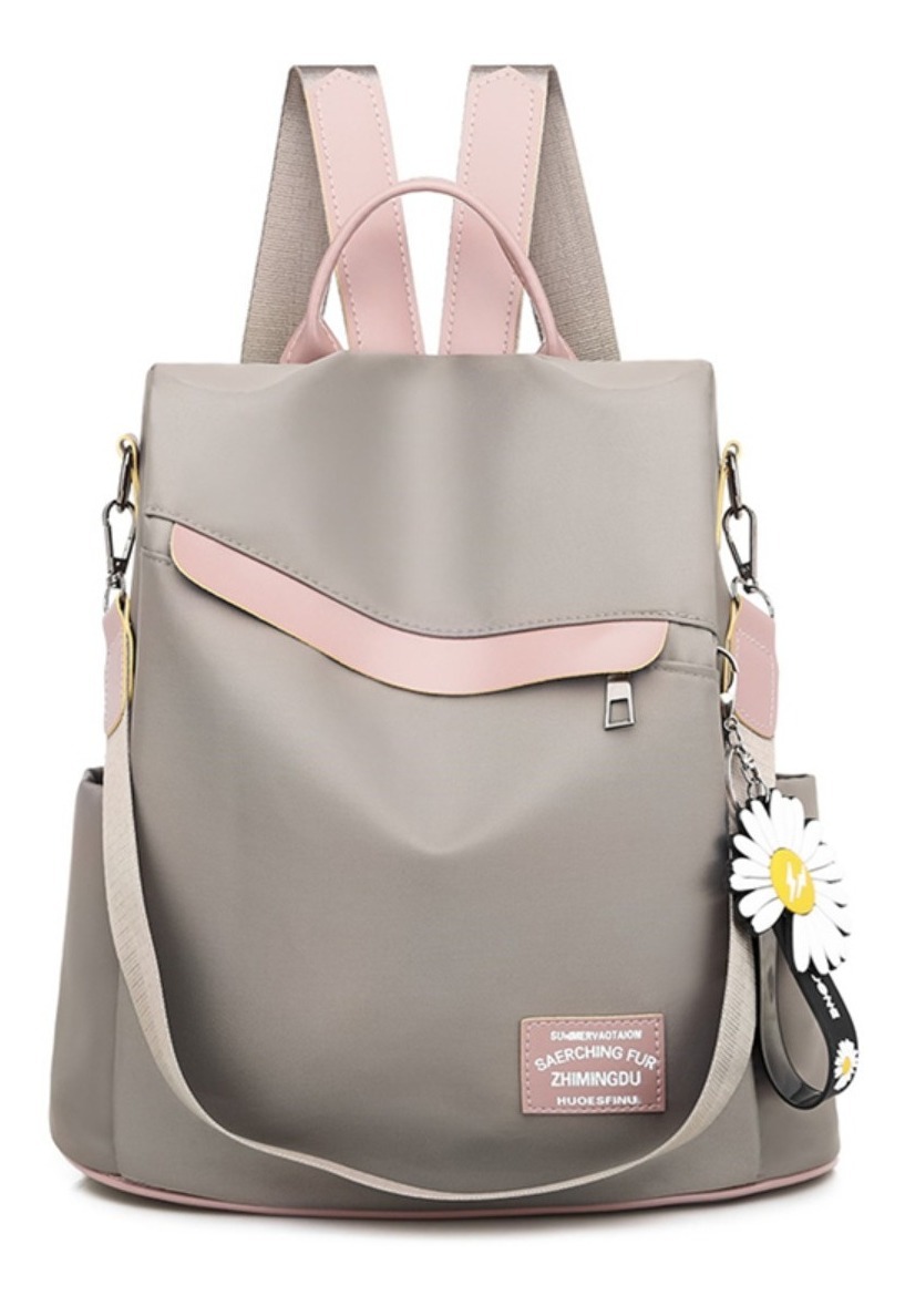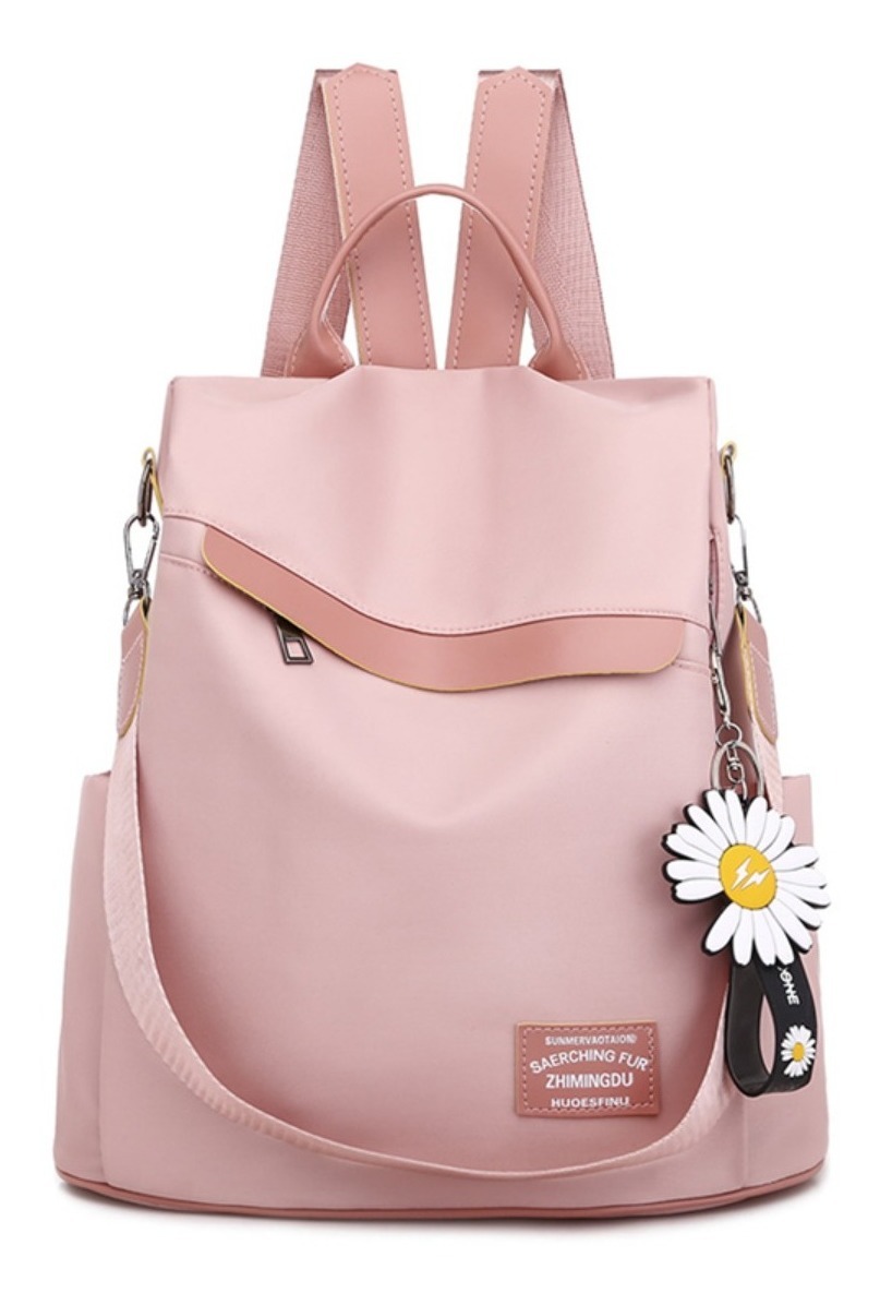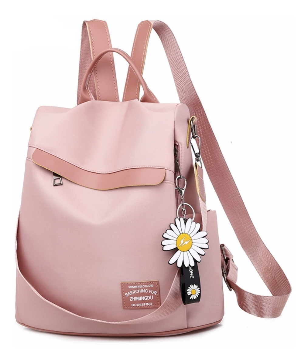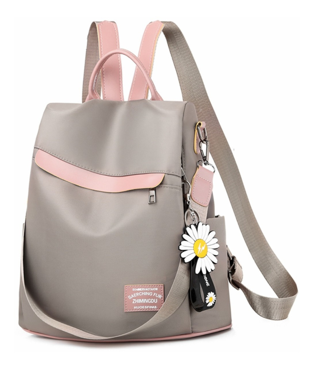 Súper practica y delicada, bolso mochila estilo urbano, con cierre en la espalda para evitar robos, cuenta con dos bolsillos abiertos a sus costados para botellas, basura, etc. Un bolsillo frontal de rápido acceso para tus artículos esenciales, y dos bolsillos a los costados, con cierre. En el interior cuenta con un bolsillo con cierre y un bolsillo sin cierre. Incluye decoración de margarita opcional estilo llavero. Correas ajustables para usar como mochila, cinta para usar al hombro incluida.