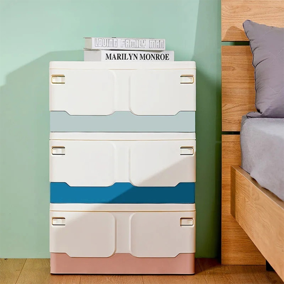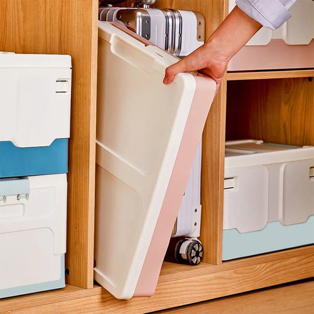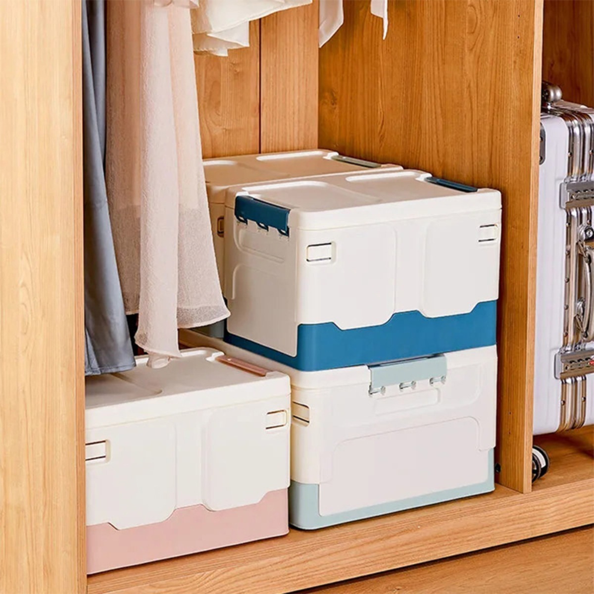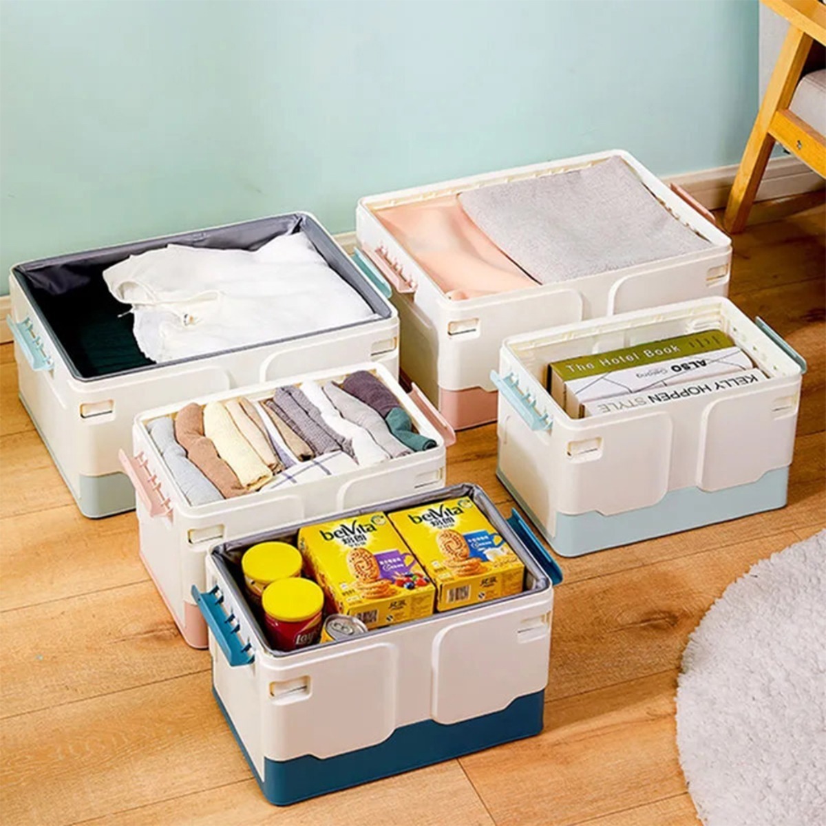 Cajas de almacenamiento para organización del hogar o comercio. Apilables, plegables, lo que las hace perfectas para ahorrar espacio, con tapa y con dos trancas en los costados para evitar que se abra sin querer, o que se caigan sus contenidos. Fabricadas en PP