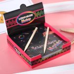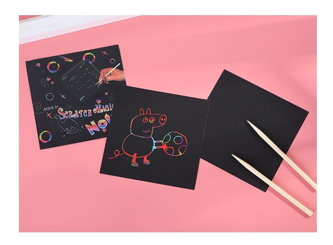 Las notas cuentan con colores brillantes que se esconden debajo del revestimiento mate; los niños simplemente usan el lápiz de madera incluido para revelarlos con un simple trazo.