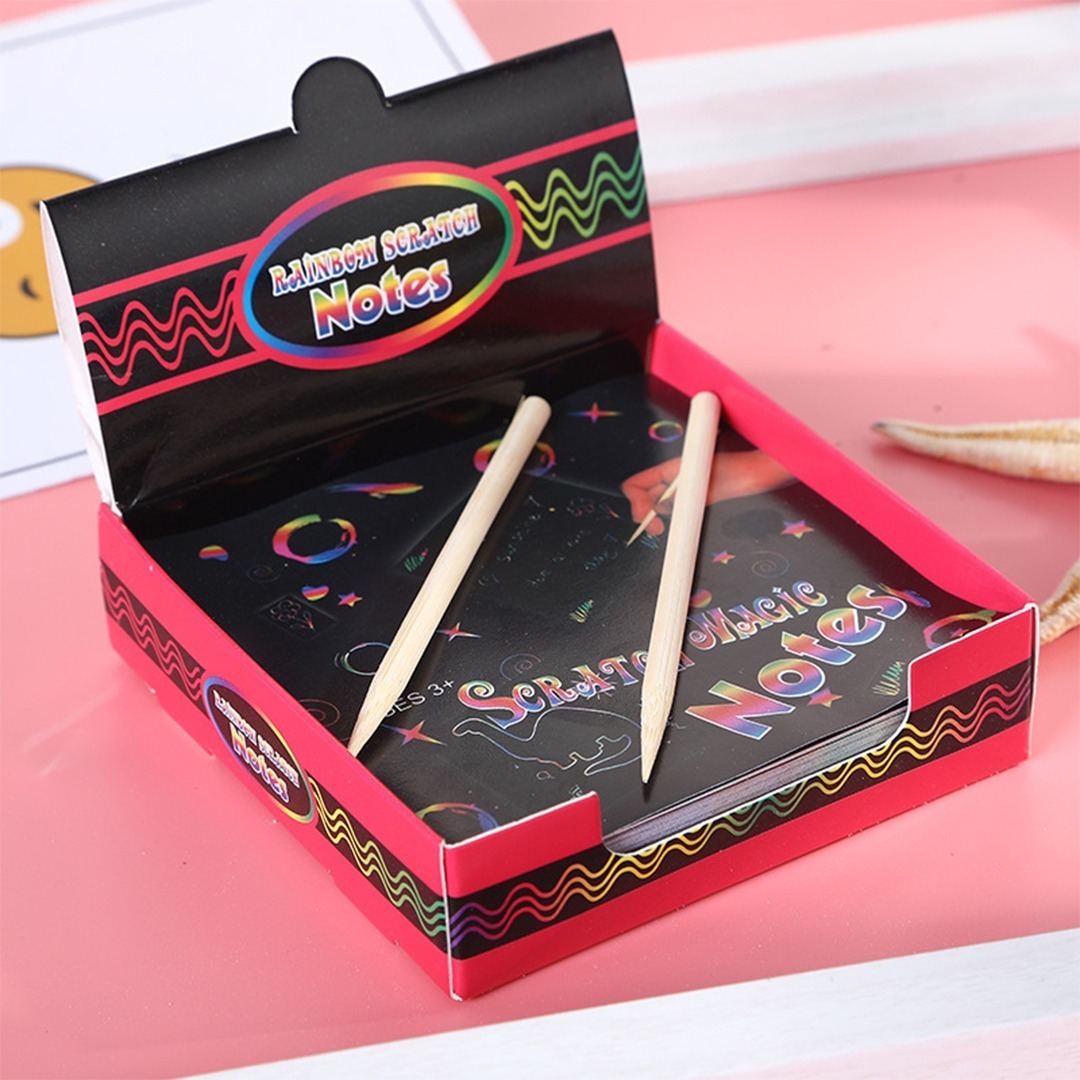 El block incluye 100 mini notas de arco iris más dos bolígrafos de madera, son fáciles de usar, los niños pueden utilizarlas para notas, grabar garabatos, y crear ilustraciones y diseños geniales.