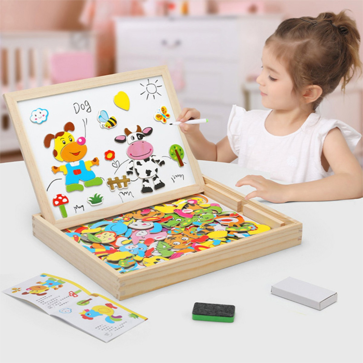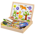 ¡Diversión garantizada! Esta caja pizarra doble, fabricada en madera, es ideal para que los niños jueguen y aprendan. Incluye un puzzle de animales imantado para armar escenas y estimular la creatividad. Además, viene con tiza, marcador y borrador para que puedan dibujar y escribir sin límites. El lado de la pizarra para marcador es imantado, lo que hace el juego más interactivo. ¡Perfecta para horas de entretenimiento y desarrollo!
