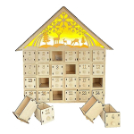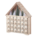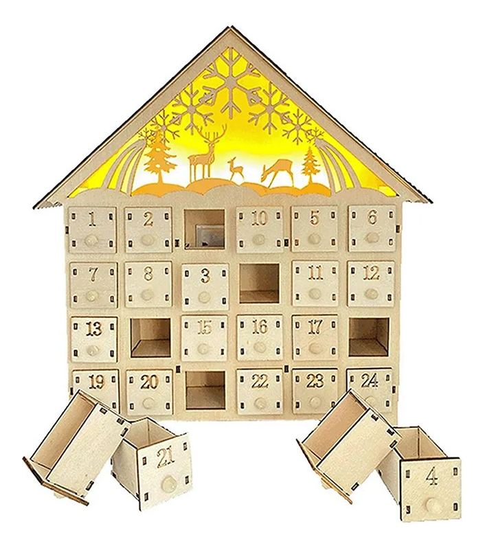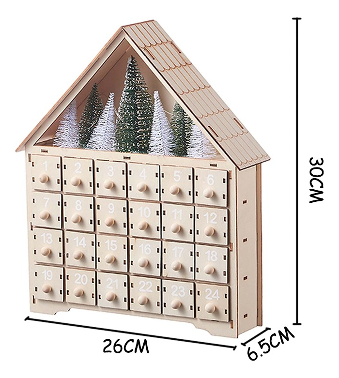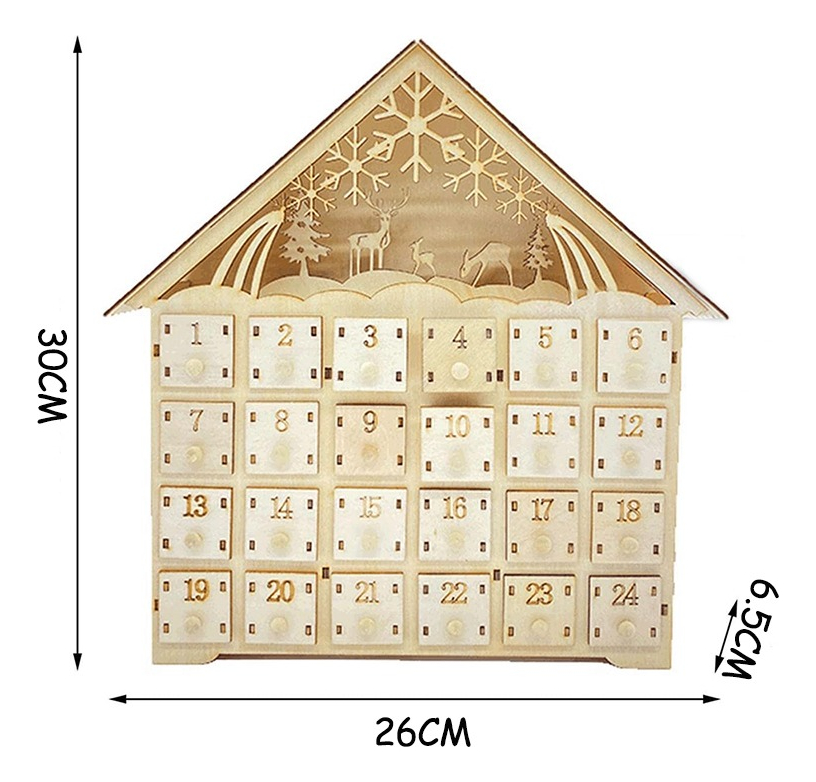 Descubre la magia de la temporada navideña con nuestro encantador Calendario de Adviento con luces LED, elaborado con material de madera para añadir un toque cálido y festivo a tu hogar. Con unas dimensiones de 24 cm de ancho y 30 cm de altura, este calendario presenta 24 cautivadoras casillas, cada una con medidas de 3 cm de ancho, 4 cm de profundidad y 3 cm de altura.