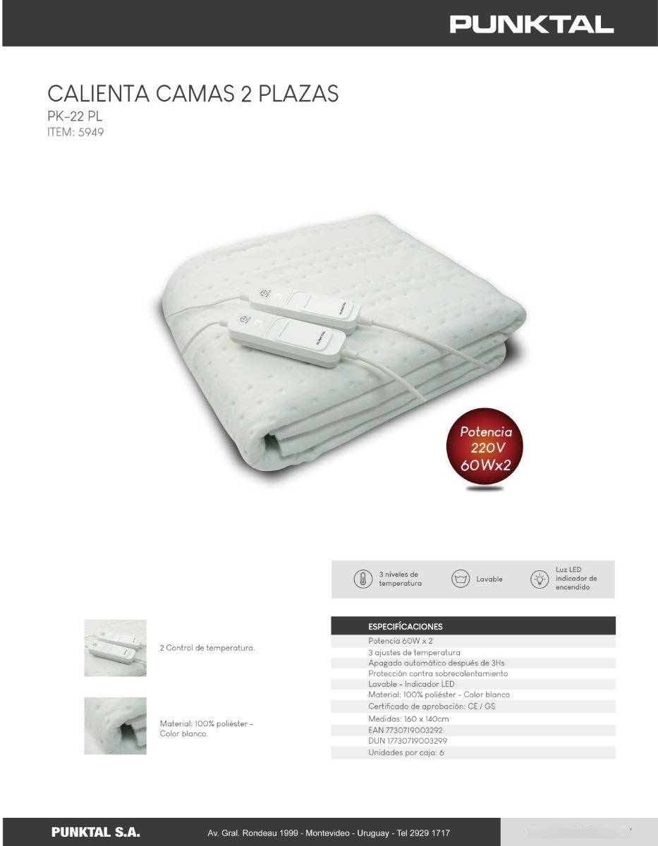 CALIENTA CAMA 2 PLAZAS PUNKTAL PK-22 PL