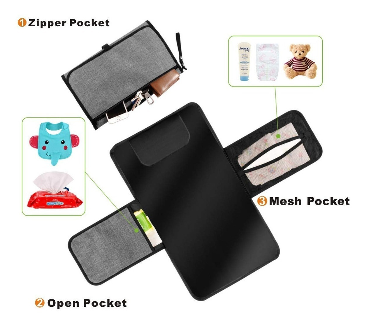 Cambiador para bebé práctico, cómodo e impermeable, con un diseño moderno y funcional. Fabricado con materiales de excelente calidad, este cambiador incluye tres bolsillos: uno para pañales, otro para toallitas y un bolsillo exterior para guardar artículos personales como celular, monedero, etc. Ideal para padres que buscan comodidad y practicidad al cambiar al bebé.