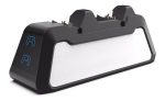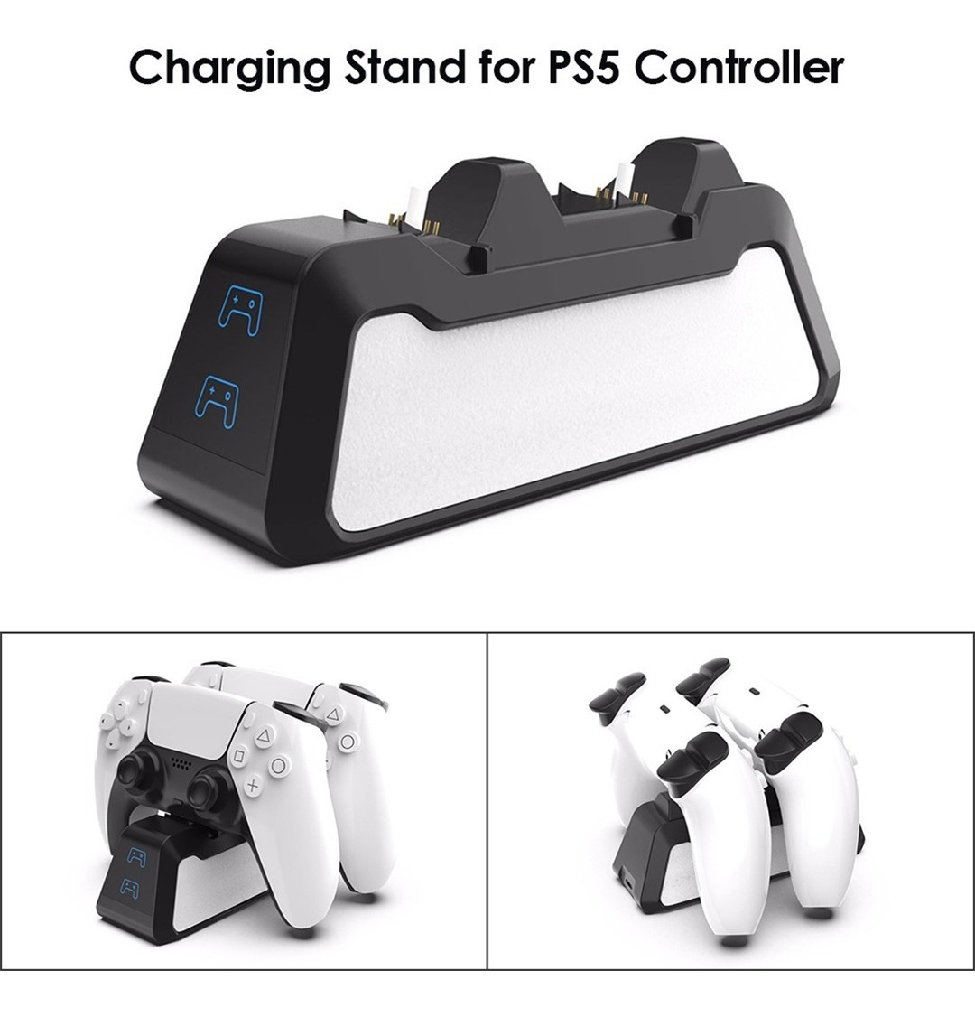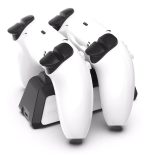 Cargador dual de carga rápida para controladores ps5. Adopta una interfaz USB 3,1 tipo C y adopta la salida de la sonda de alta corriente de resorte. La luz azul está encendida después de encenderla, la luz roja está encendida cuando el controlador está cargando, y la luz azul está encendida cuando el controlador está completamente cargado.