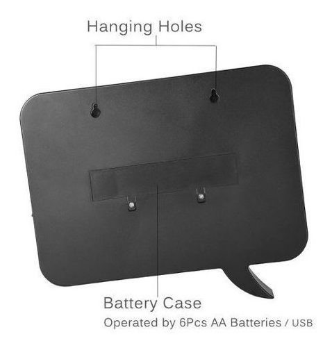– Cable USB para enchufar a la pared. – Marcadores negro, rojo y azul. – Se puede colgar o apoyar en una superficie. 6 pilas (no incluidas). – Medida Historieta: 30x26x5cm.