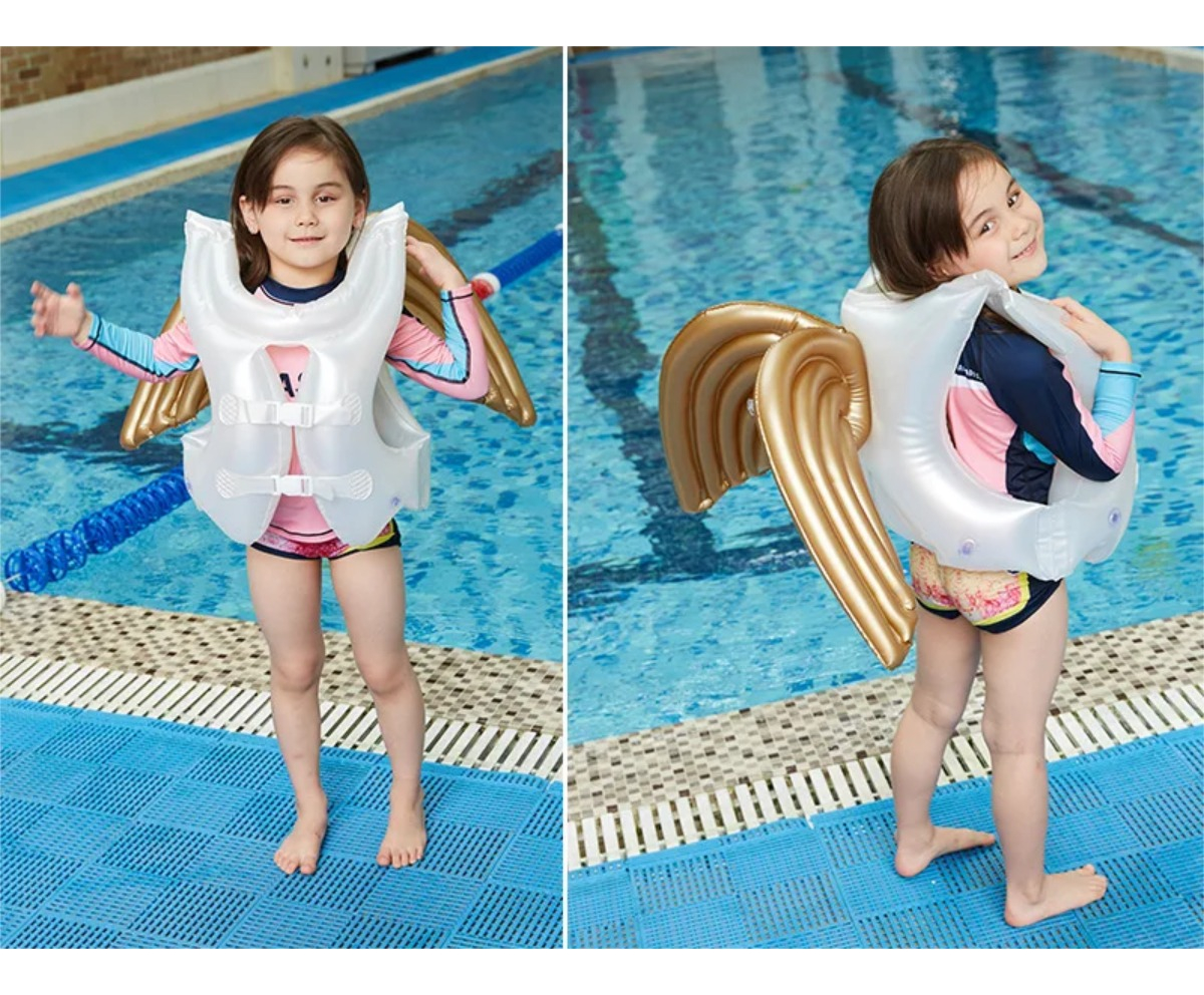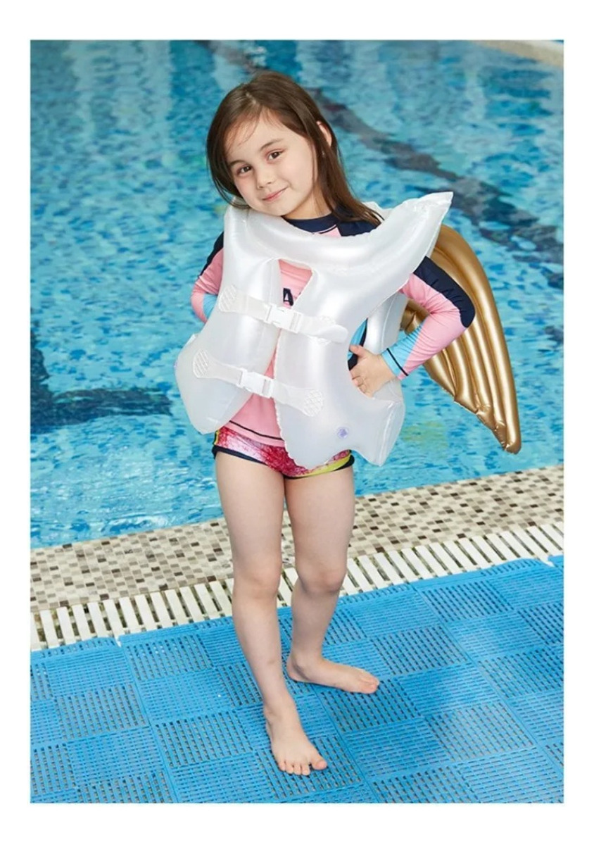 ¡Deja que tus pequeños se sumerjan en la diversión con este chaleco inflable para niños! Diseñado para brindar seguridad y estilo, este chaleco no solo ayudará a tus hijos mientras aprenden a nadar, sino que también les dará la sensación de ser unos auténticos angelitos en el agua.