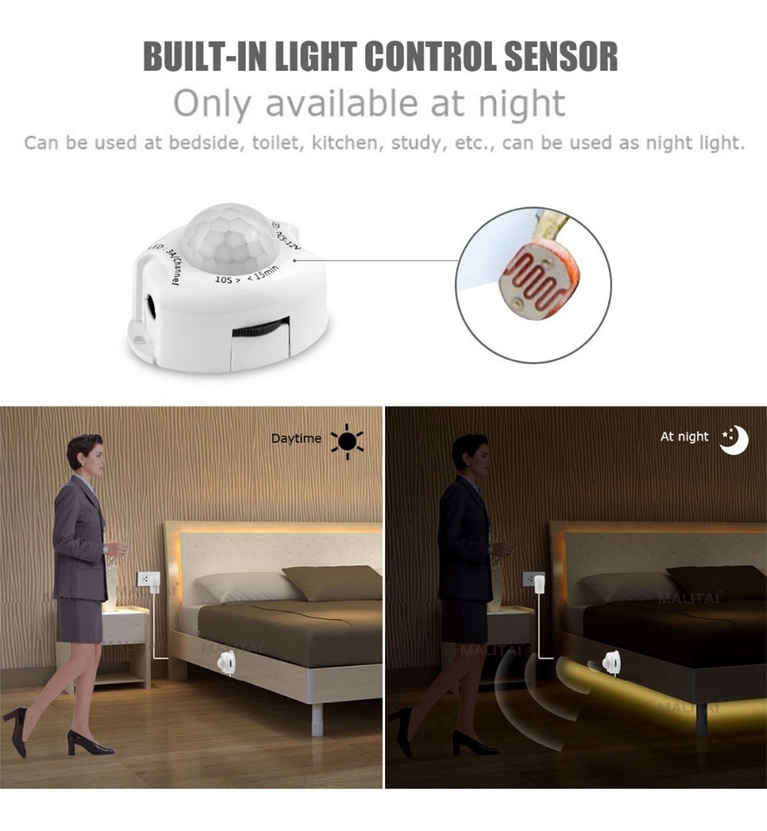 Instrucciones: En primer lugar, comprueba si conectas la tira led correctamente. Si la conexión es incorrecta, la tira de luz siempre estará encendida. En segundo lugar, la tira led del sensor de movimiento solo funciona en un ambiente completamente oscuro. Así que prueba por la noche.