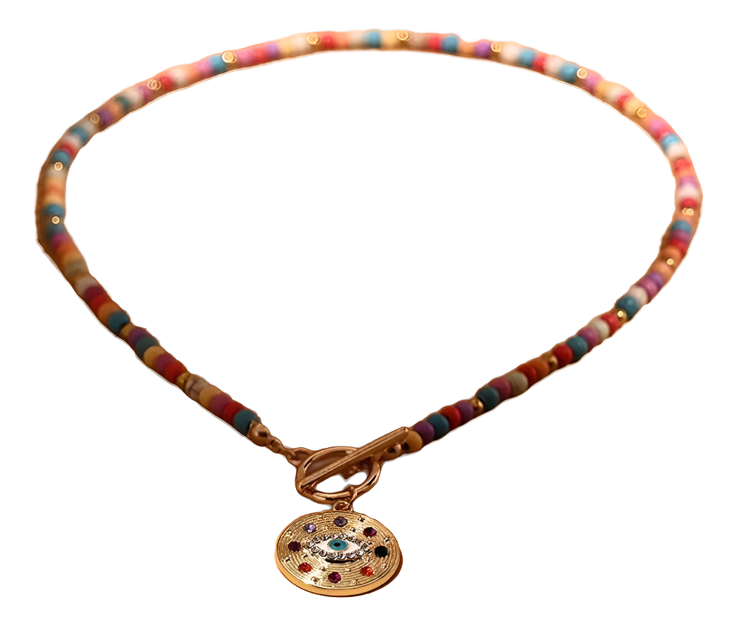 Este collar único presenta un amuleto de Ojo Turco, diseñado para proteger contra las malas energías y atraer buena suerte. Las cuentas de piedra coloridas le dan un toque vibrante y lleno de personalidad, convirtiéndolo en un accesorio llamativo y significativo.