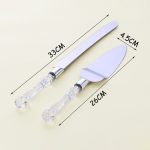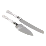 Set de pala y cuchillo ideal para cortar y servir tortas, postres y demás en fiestas, cumpleaños, bodas etc. Fabricado en plástico transparente (Mango) y acero inoxidable (Cuchillo y pala) Medidas aproximadas: 33cm de largo (cuchillo) 26cm x 4cm (Pala)