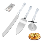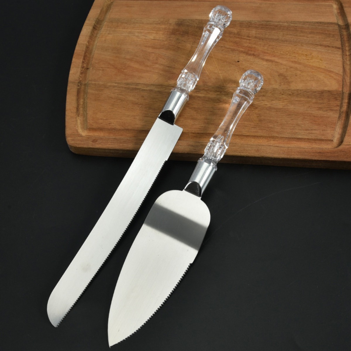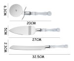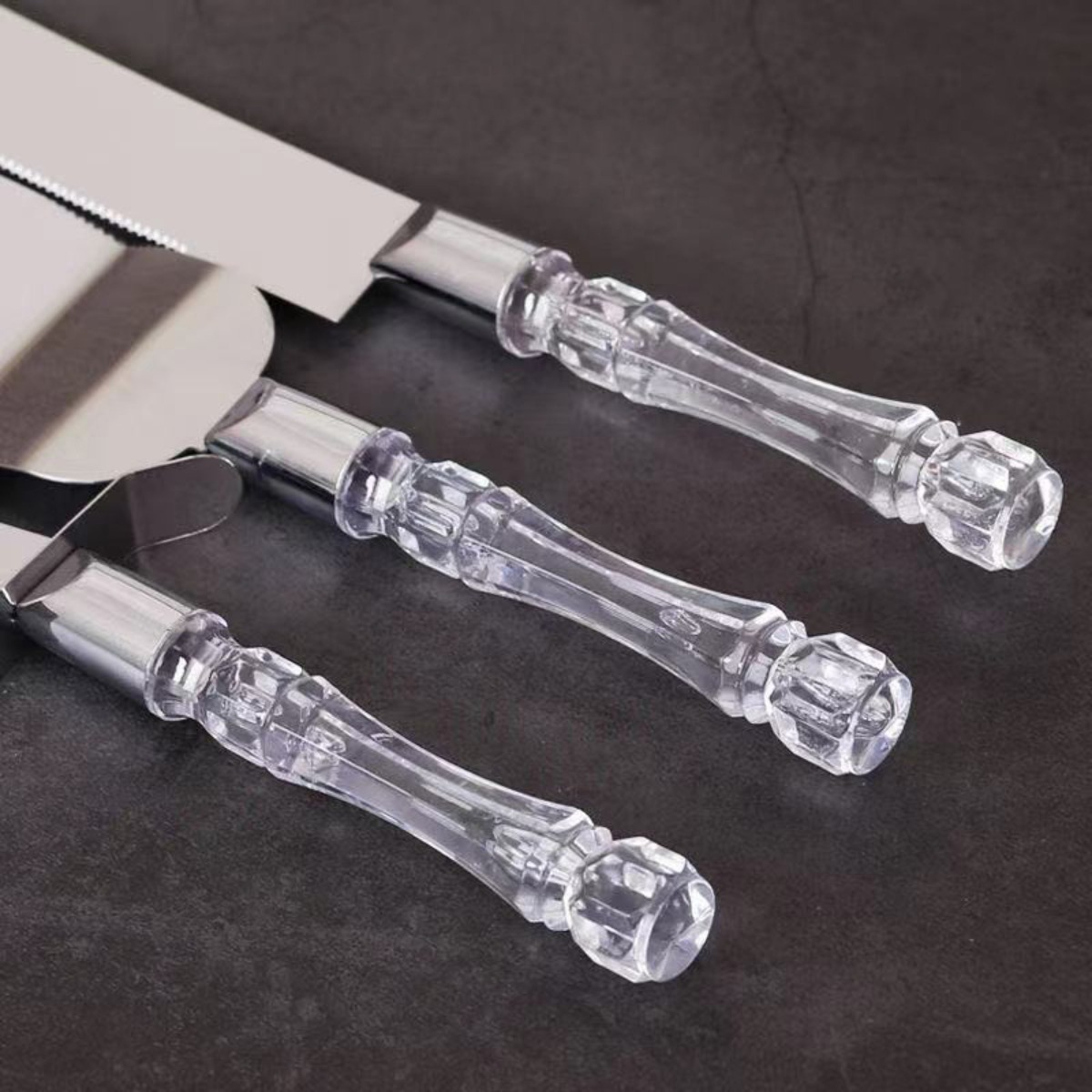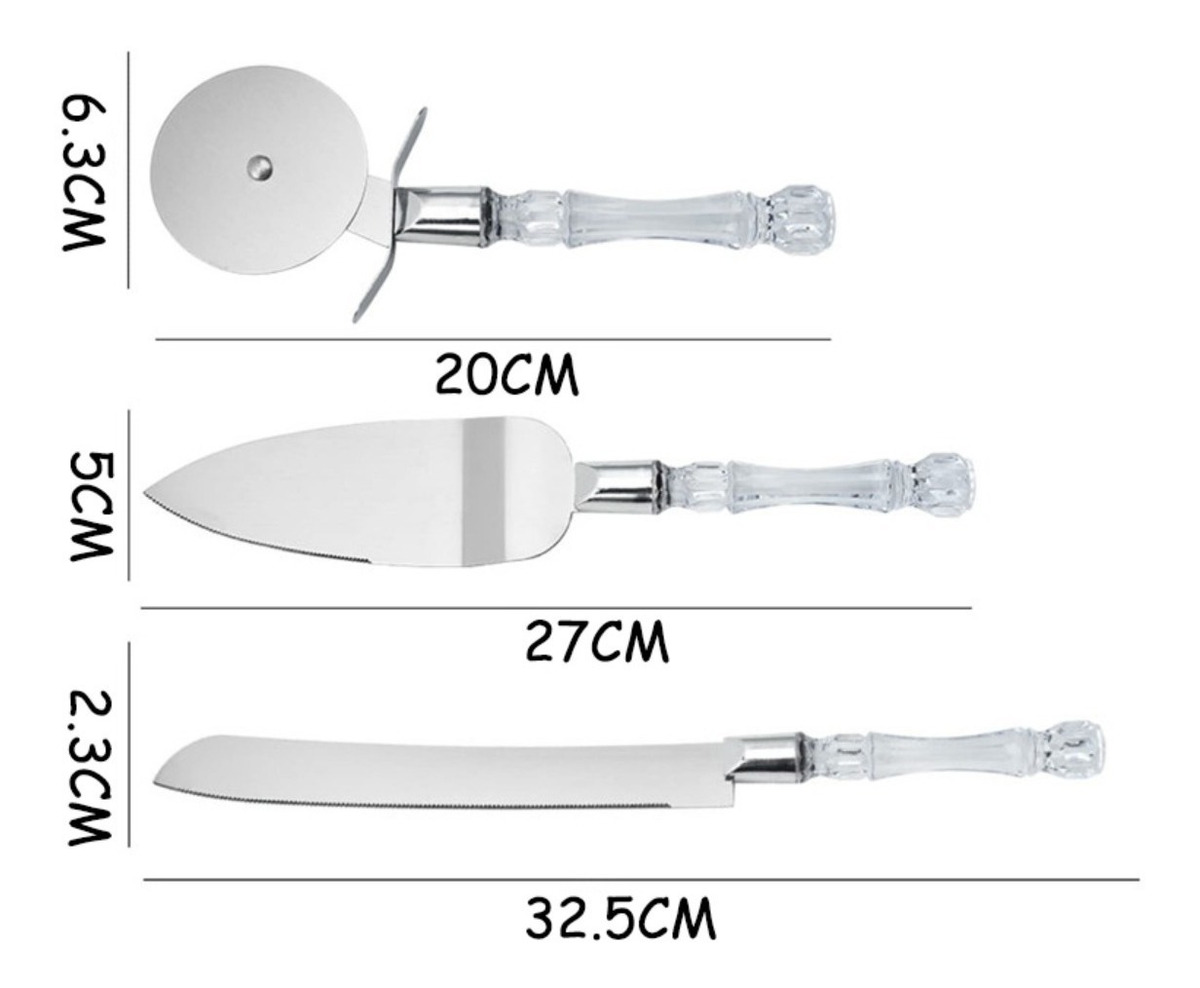 Set de pala, cuchillo y cortante ideal para cortar y servir tortas, postres y demás en fiestas, cumpleaños, bodas etc. Fabricado en plástico transparente (Mango) y acero inoxidable (Cuchillo, pala y cortante) Medidas aproximadas: 33cm de largo (cuchillo) 26cm x 4cm (Pala) 20cm x 6cm (Cortante)