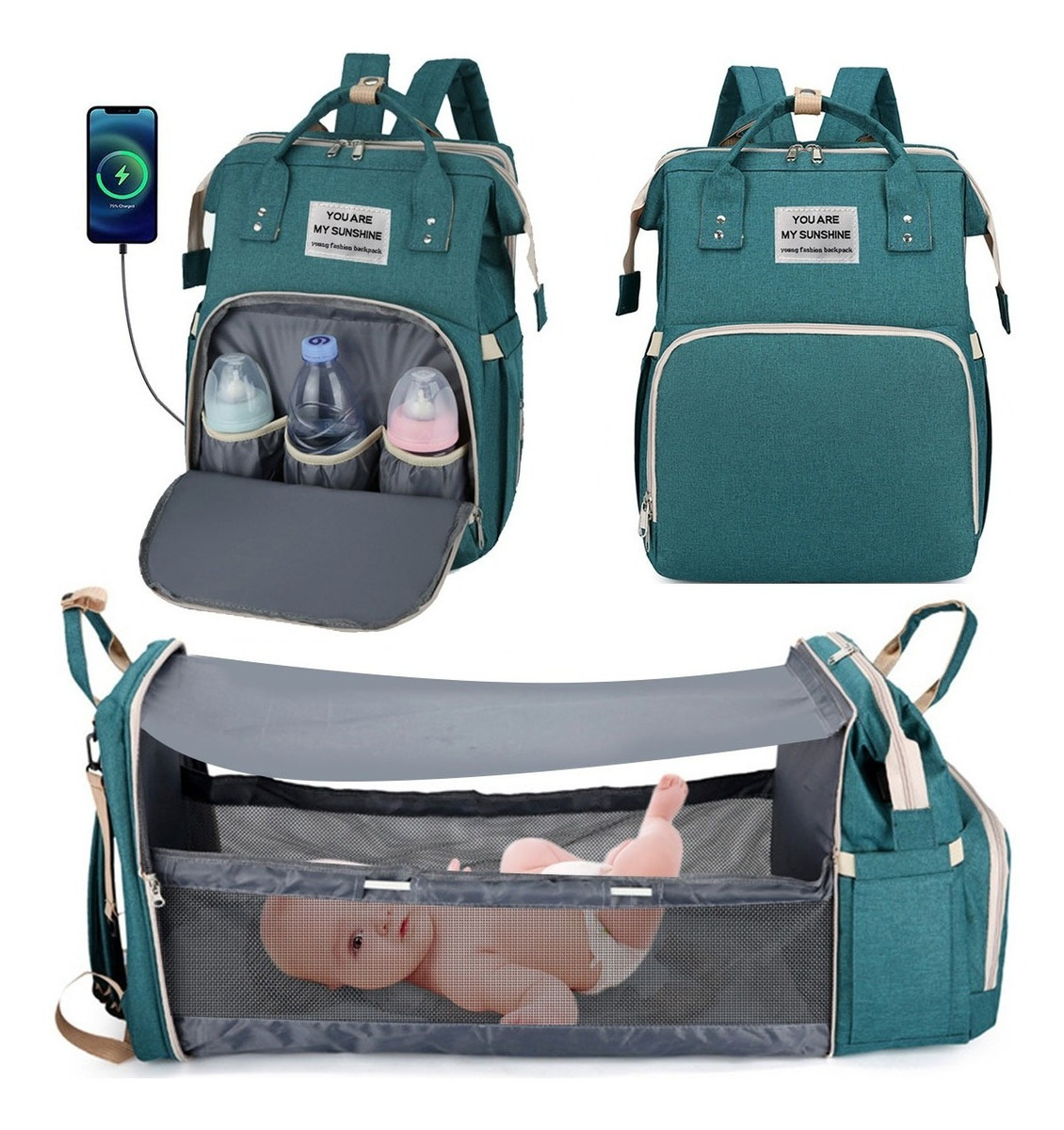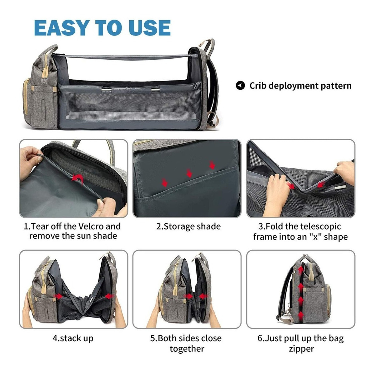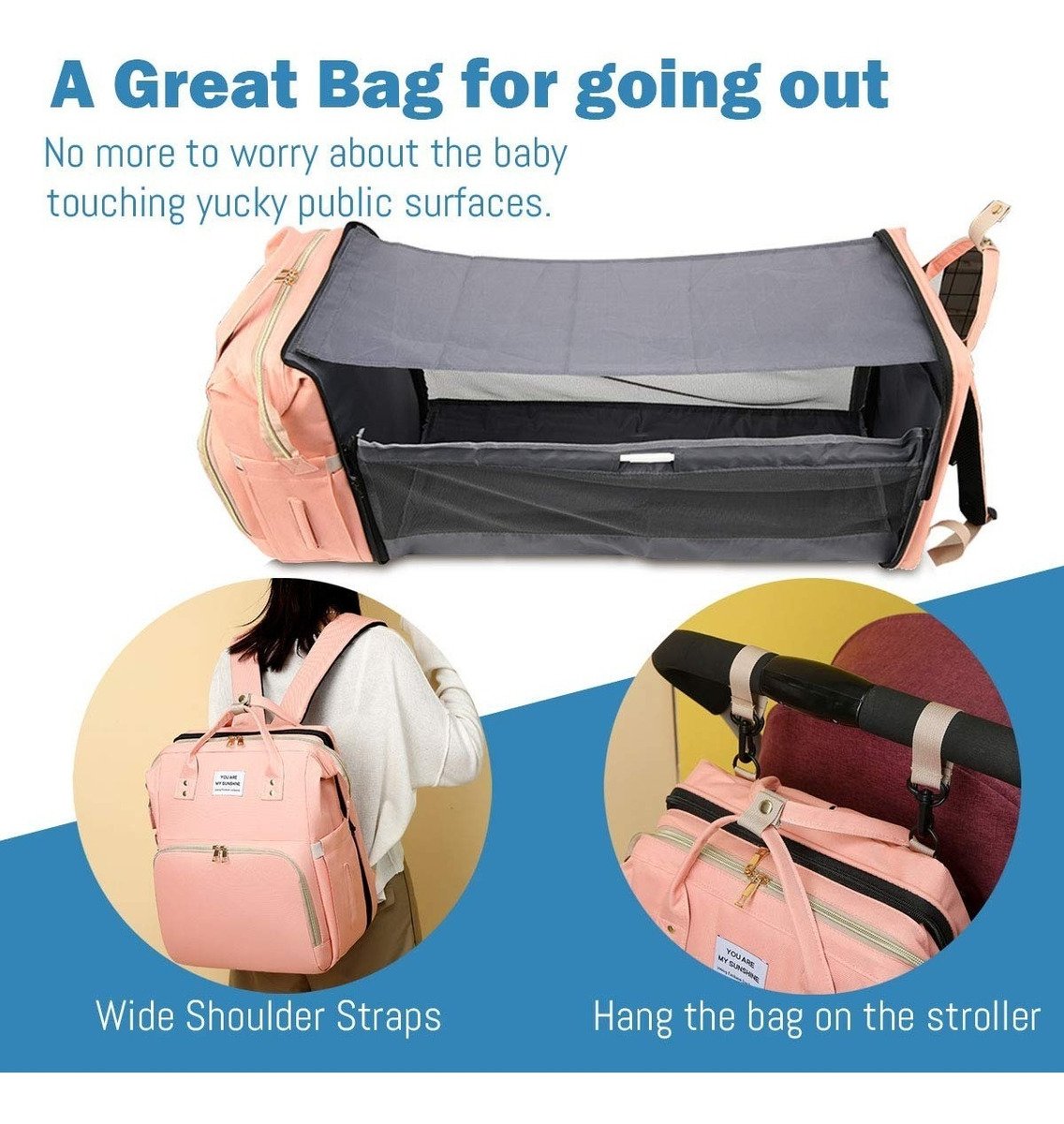 A simple vista puede parecer un bolso maternal, pero en instantes puede convertirse en una cuna para bebé o un cambiador portátil de 30,5cm x 70cm de largo proporcionando un espacio seguro e higiénico para cambiar tu bebé; o que descanse al aire libre, ya que cuenta con colchón, mosquitera y tela parasol.