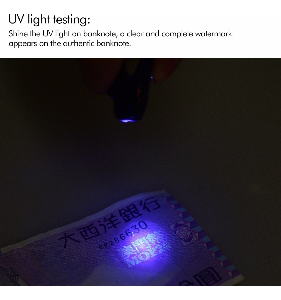 Fácil de usar, pequeño, portátil y rápido. Detecte cualquier billete de cualquier divisa mediante UV (ultravioleta) y MG (magnetismo): Sólo debe pasar el cabezal magnético por el número de serie o la banda magnética del billete. También puede utilizar su luz ultravioleta.