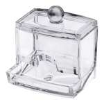 Dispensador compacto en acrílico para cotonetes. Diseño elegante que al ser transparente no genera peso visual, y al ser compacto entra perfectamente en cualquier lugar. Con tapa y y de fácil acceso para su uso.