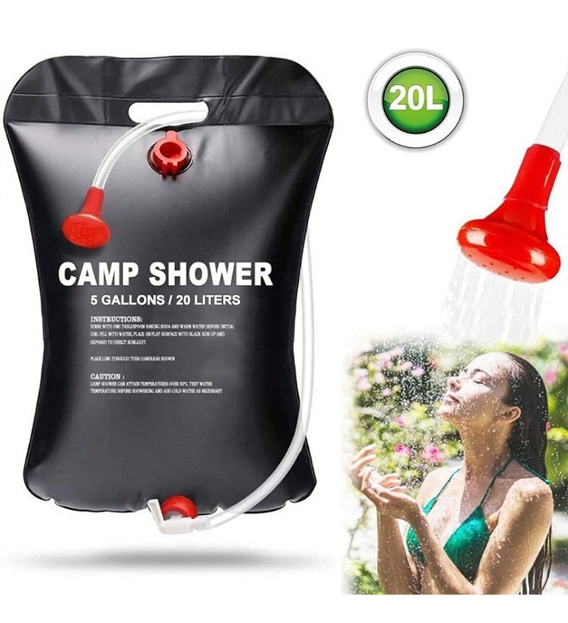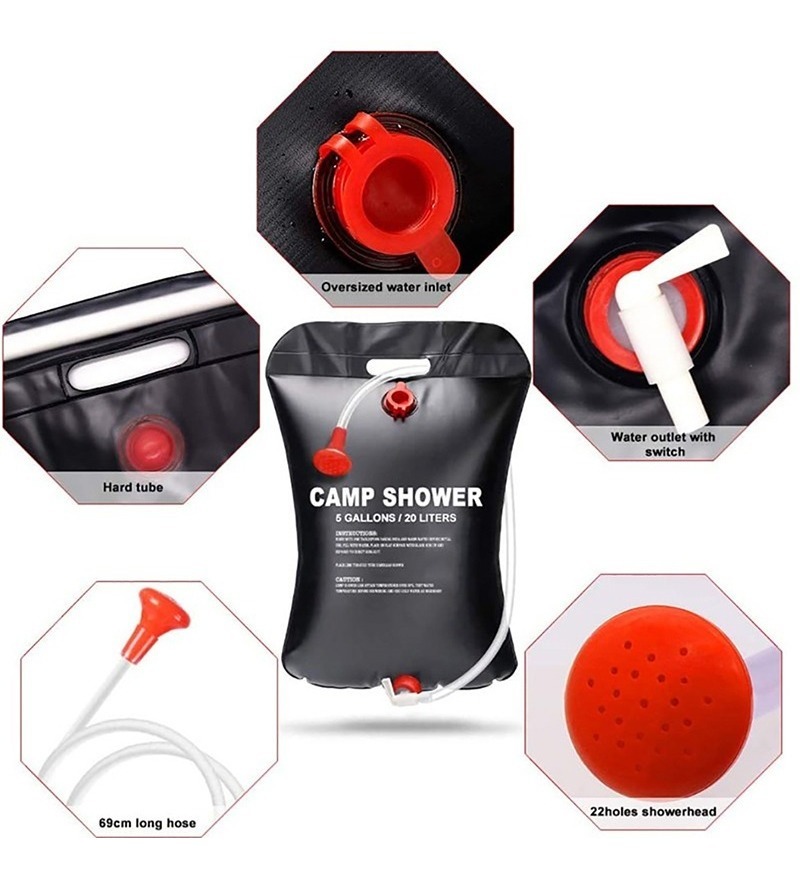 Ducha portatil fácil de llevar al aire libre también almacena agua para la vida diaria. La bolsa de ducha solar ofrece un cabezal de ducha con llave de paso (abierto/cerrado) que controla el flujo de agua de ninguno, bajo a alto. ¡Te ofrece una experiencia de ducha mucho mejor! Está hecha con materiales respetuosos con el medio ambiente que son seguros para la vida humana. Bolsa de ducha portátil de camping con mango fuerte para colgar y transportar de forma fiable. Cuélgalo en una tienda de campaña o átala en una rama de árbol. Ideal para viajes de camping y durante emergencias cuando no hay agua caliente disponible.