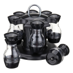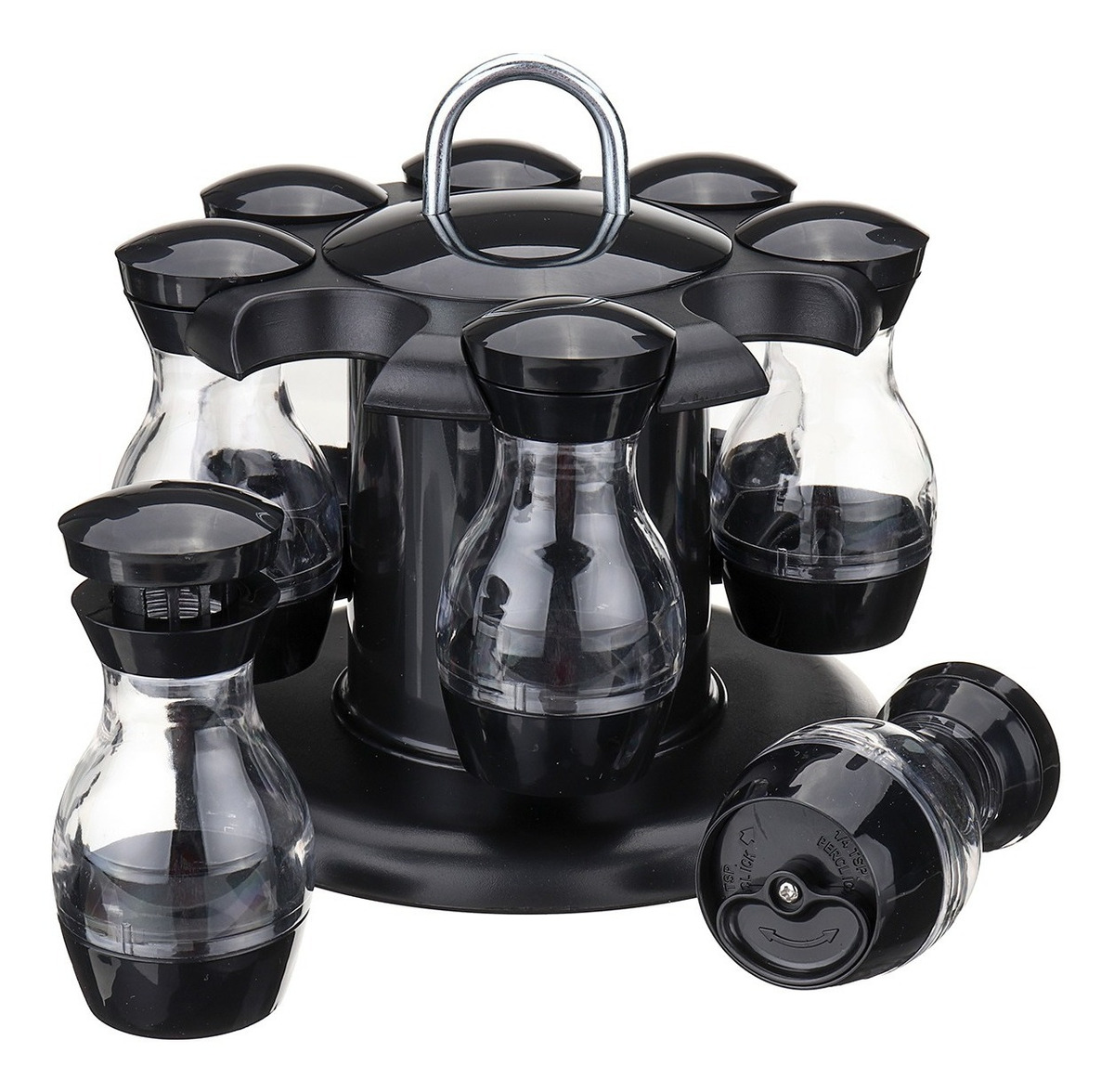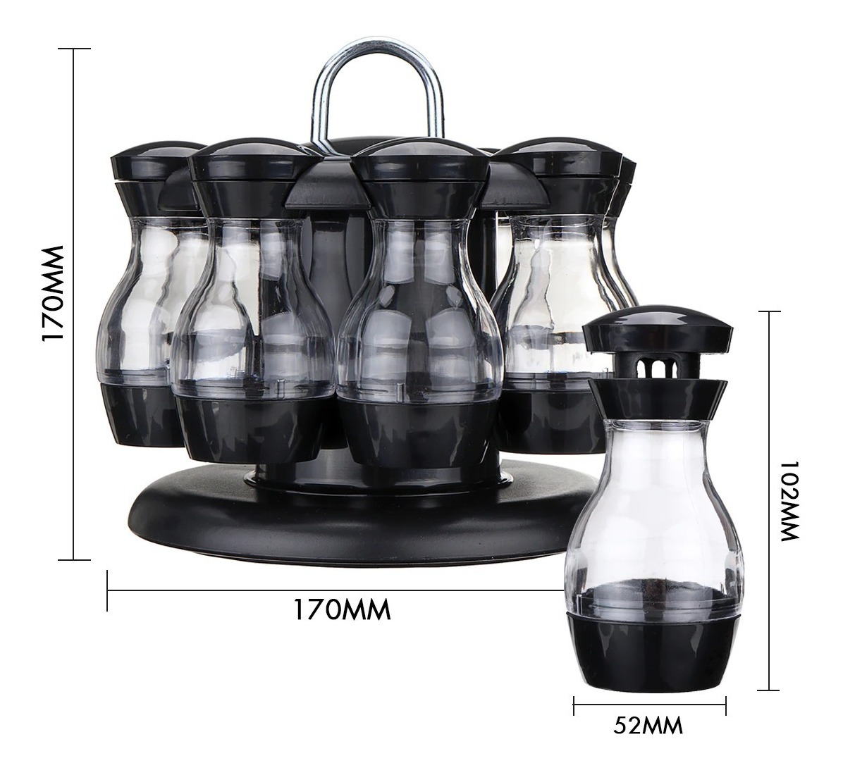 Especificación: Material: acero inoxidable Color: transparente (cuerpo del frasco) + Negro Número de jarras: 8 con tapas de tamiz. Tamaño: 17 de alto x 17 cm de ancho Tamaño del tarro: 10 cm de alto x 5 cm de ancho Con base giratoria