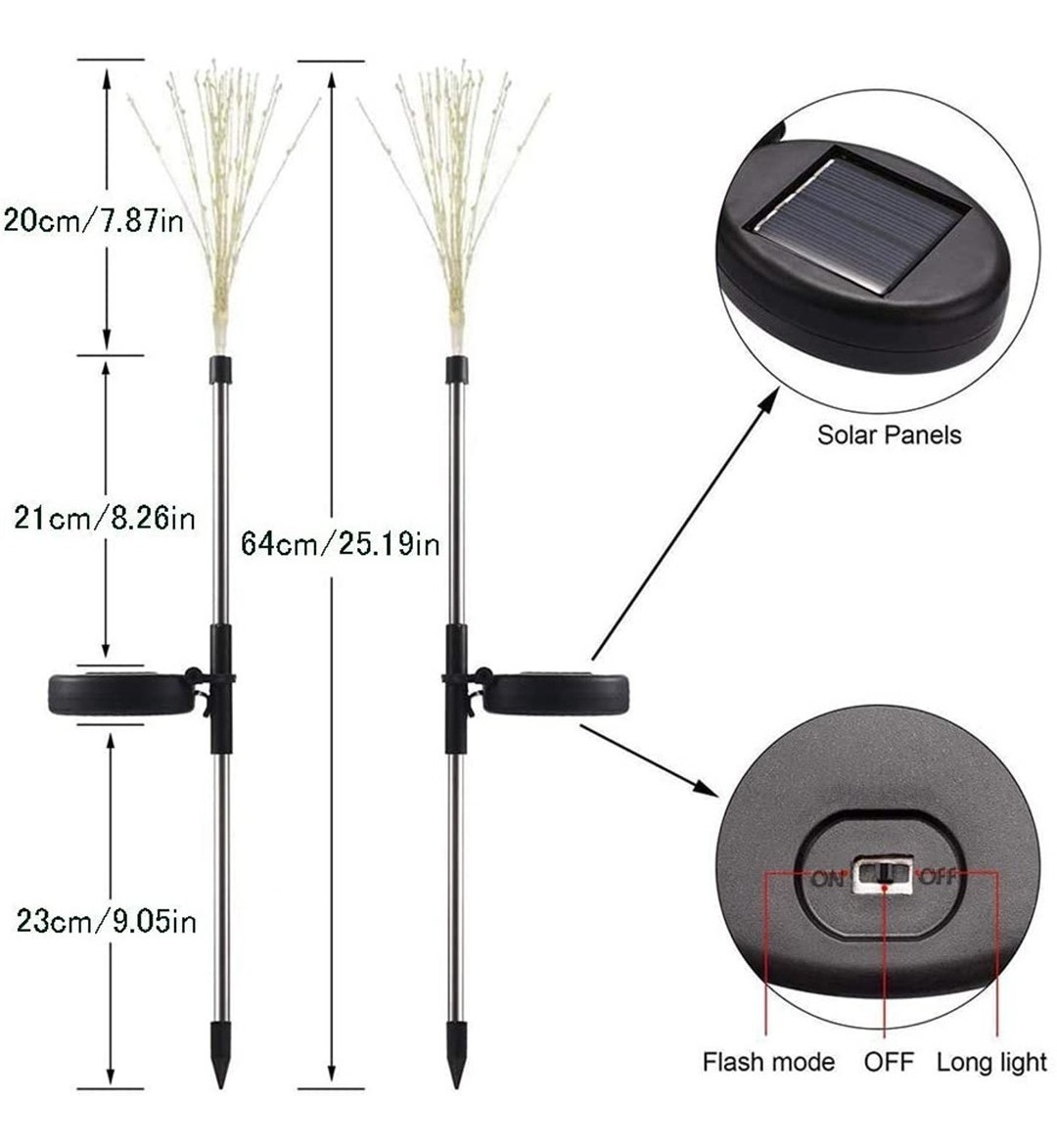 Características: – Hay dos modos de funcionamiento, la parte inferior del panel solar tiene un interruptor de control de botón y modo. – Hay 3 leds en cada línea 90led tiene 30 líneas 150led tiene 50 líneas – El LED luces de jardín adecuado para uso al aire libre no te preocupes sobre la lluvia nieve frost o aguanieve