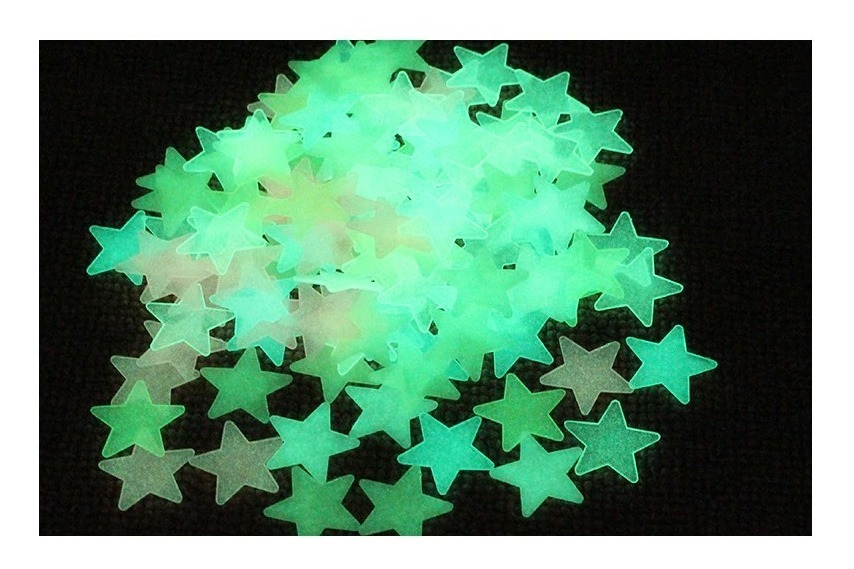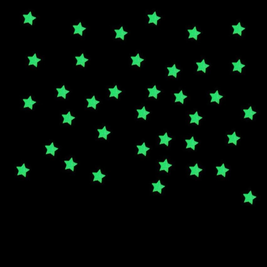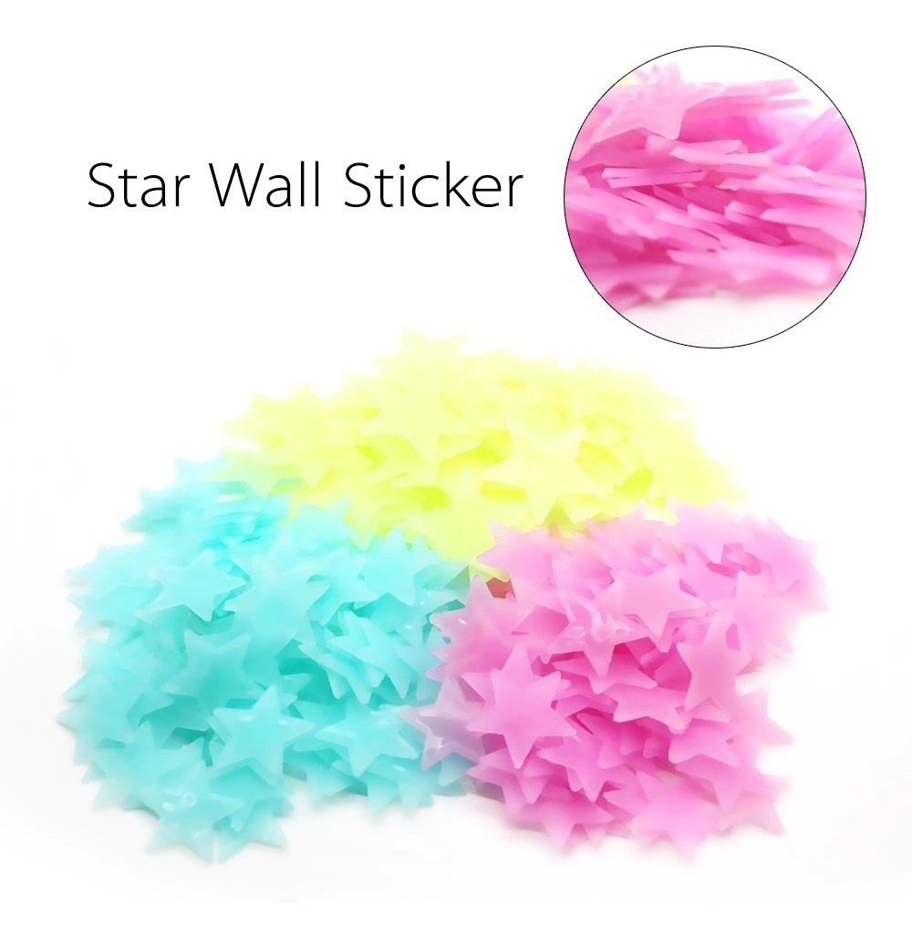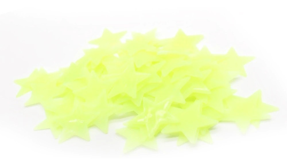 Estrellas Fluorescentes Luminosas en 3D para Pared, fabricadas en PVC de alta calidad que brillan en la oscuridad. Ideales para decorar dormitorios, paredes o cualquier espacio de la casa, creando un ambiente mágico. Con un tamaño de 3 cm de diámetro, son adhesivas y se incluyen cintas dobles para pegarlas fácilmente. El paquete contiene aproximadamente 80 estrellas, perfectas para armar figuras o destacar objetos en la oscuridad.