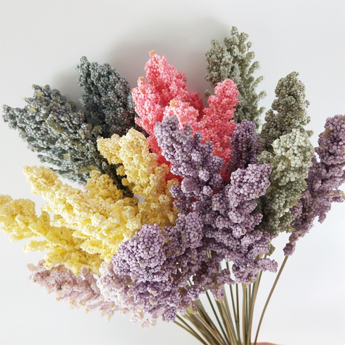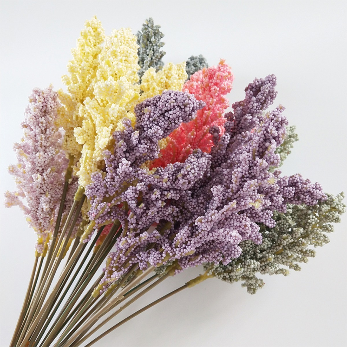 Pack x6 flores decorativas que simulan una planta de lavanda, formado por bolitas pegadas entre si, perfecto para una deco clásica, atemporal.