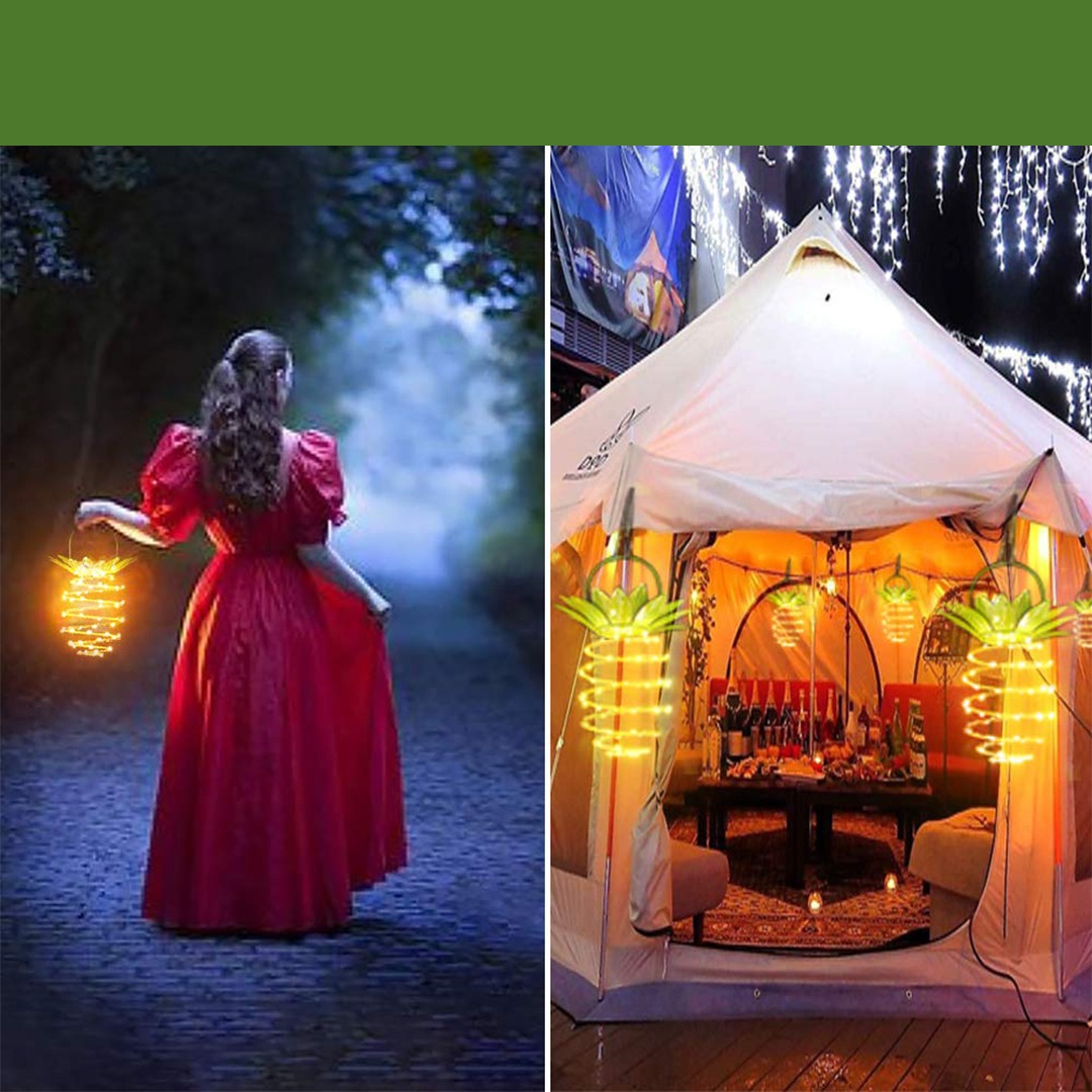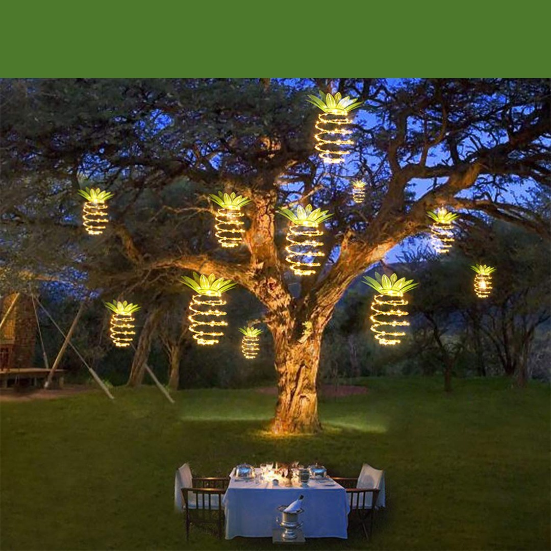 Esta guia de luz LED con forma de ananá/piña resistente al agua, este producto utiliza energía solar gracias a un panel solar de 3cm x 3cm ubicado en la parte superior y funciona automáticamente; cuando el panel solar detecta luz, se apagará automáticamente, encendiendose una vez el nivel de luz haya caído. Está hecha de hierro y alambre de cobre, dos materiales duraderos y dificiles de dañar.