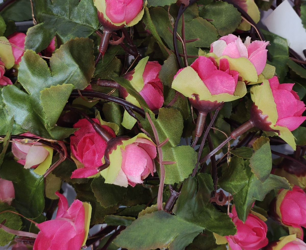 – Guia, gurinalda de luces y rosas. Hojas y flores de seda con impresión 3D y tallos está hecho de plástico. Totalmente de 4.6m de longitud y 50 bombillas led, diámetro de la flor: 2,5cm. Hermosas flores rosas con suave luz blanca cálida, iluminarán su jardín o patio y agregarán un ambiente alegre a su fiesta y vacaciones.