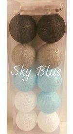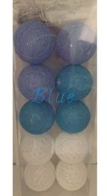 La guía es de 10 esferas plástica de hilo color azul celeste y blanco, mide 1,75 aprox. y su funcionamiento es a pila (no incluidas), luz cálida. Divinas para decorar cualquier espacio! Consultar colores