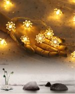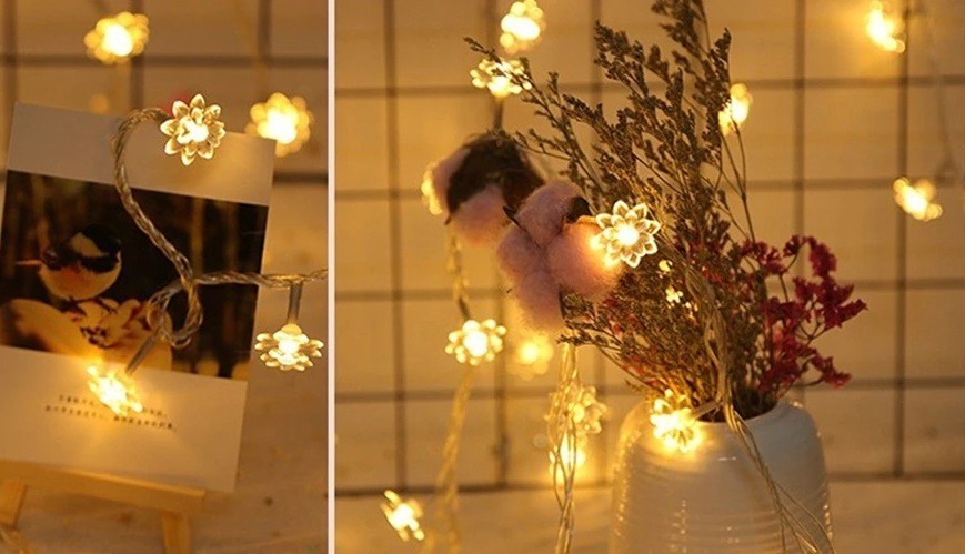 Guirnalda decorativa de 10 metros con 100 luces en forma de margaritas, ideal para ambientar cualquier espacio con un toque cálido y acogedor. Funciona con corriente eléctrica y tiene un voltaje de 6V y potencia de 220V – 240V. Perfecta para decorar habitaciones, eventos o cualquier rincón especial.