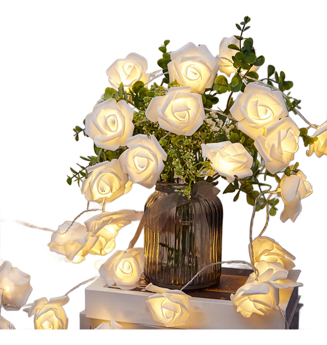 Decora cualquier espacio con esta hermosa guirnalda de luces LED de 3,3 metros, adornada con delicadas flores de rosas blancas. Funciona mediante conexión USB, lo que la hace práctica y fácil de usar en cualquier lugar. Perfecta para fiestas, eventos especiales o simplemente para darle un toque especial a tu hogar.