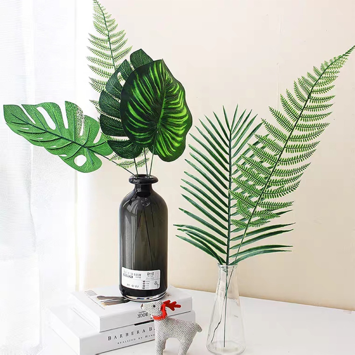 – Colores vibrantes y muy reales. – Material: cada hoja está hecha de plástico y sus tallos son de poliéster sobre un centro de alambre. – Se puede doblar y ajustar de cualquier manera. – El tallo se puede acortar mediante alicates.