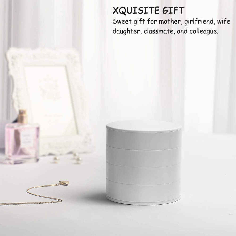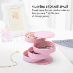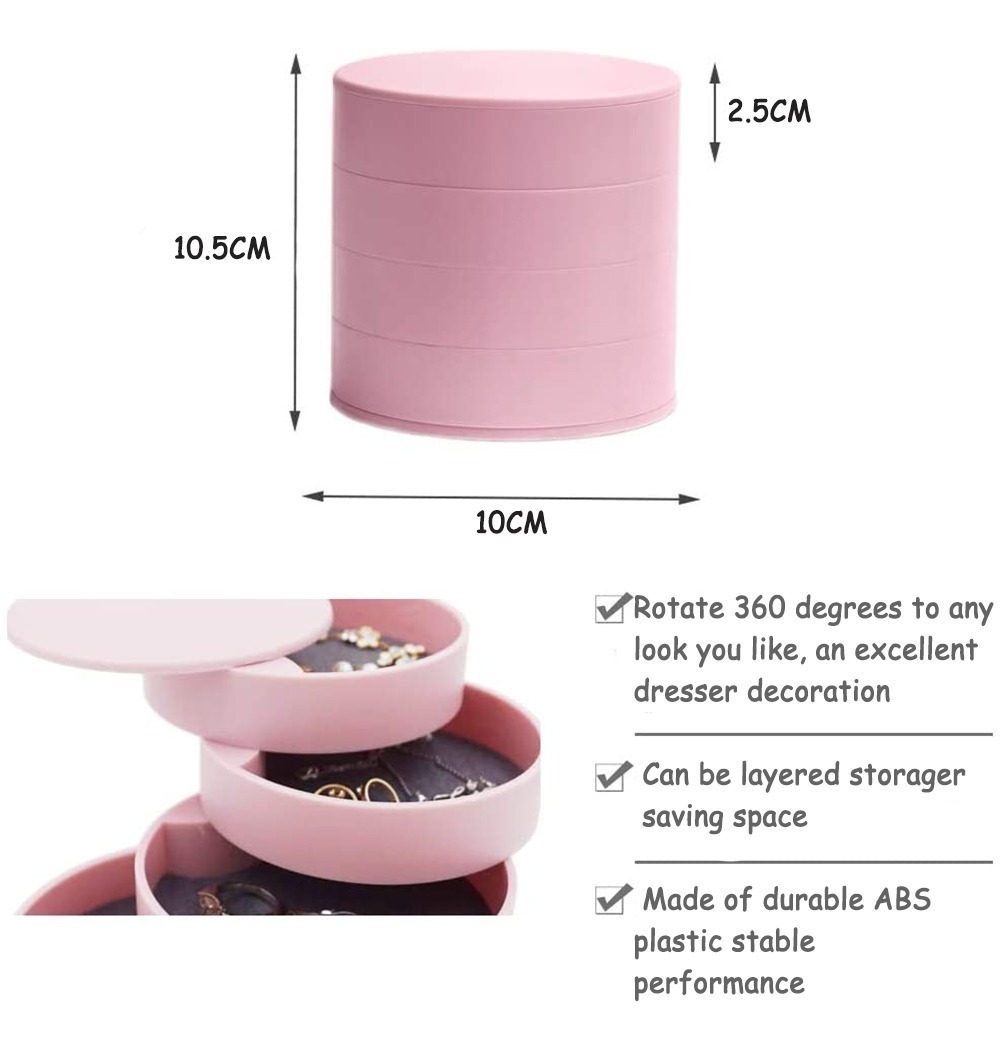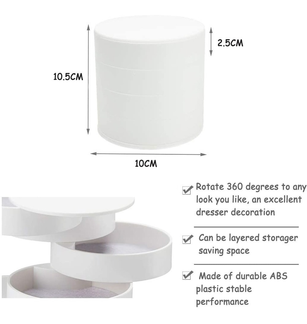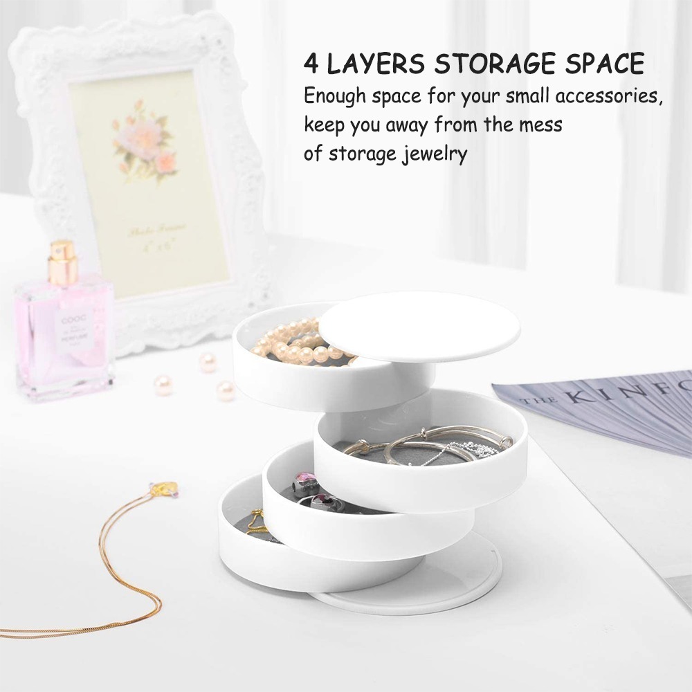 1. 360 ° giratorio, cuatro capas para almacenamiento clasificado, uso razonable del espacio, herramienta práctica, delicada y elegante 2. Guarde perfectamente sus joyas: guarde sus joyas en 4 capas. Puedes poner diferentes joyas en diferentes niveles según tus aficiones. 3. Amplia gama de aplicaciones: adecuado para organizar aretes, anillos, collares, pulseras, lápices labiales, cosméticos, llaves de coche u otros artículos pequeños.