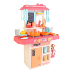 Juego de cocina para niños pequeños con luz, sonido y spray, ideal para una experiencia divertida y realista. Fabricado en plástico resistente, incluye 41 piezas y accesorios como tomate, huevo frito, choclo, cuchara, tenedor, olla, sartén, espátula, cucharón, cuchillo, salero, pimentero, vaso, entre otros. Viene con pilas AA y pegotines decorativos. Además, cuenta con un menú para que los más pequeños puedan elegir qué cocinar, estimulando así la imaginación, el juego creativo y la diversión.