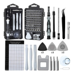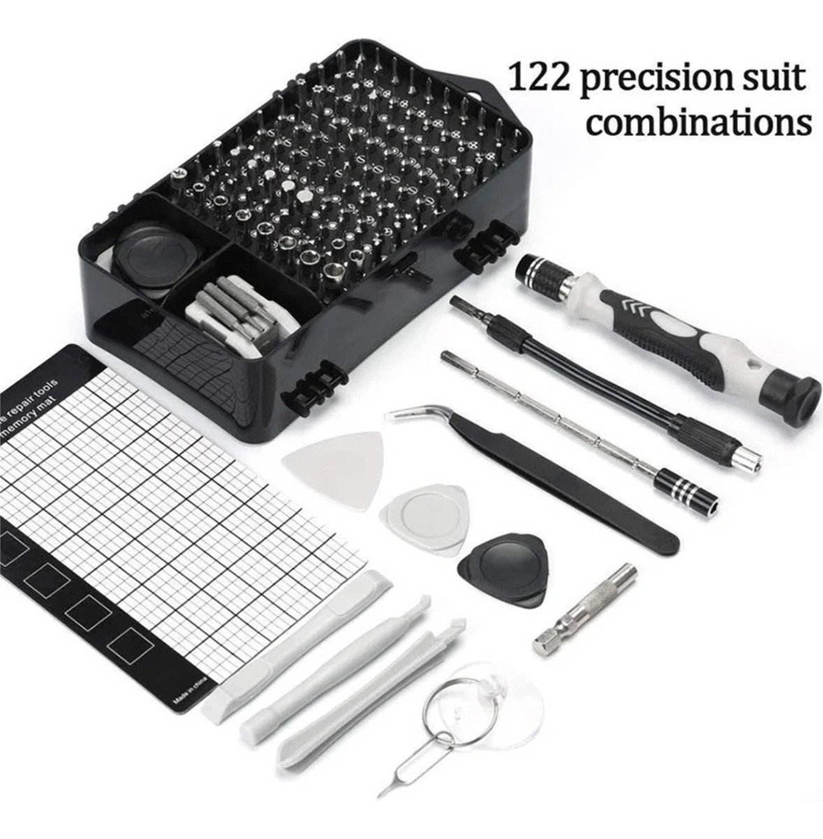 El juego de destornilladores 122 en 1 Incluye 98 brocas de destornillador, 3 brocas de destornillador TorxTR, 1 mango de controlador magnetizado, 1 magnetizador/desmagnetizador, 1 eje de extensión flexible, 1 enchufe de manga hexagonal para taladros inalámbricos, 1 pinza antiestática, 2 palanca de plástico, 3 herramientas ultrafinas y 6 herramientas de palanca triangulares normales.