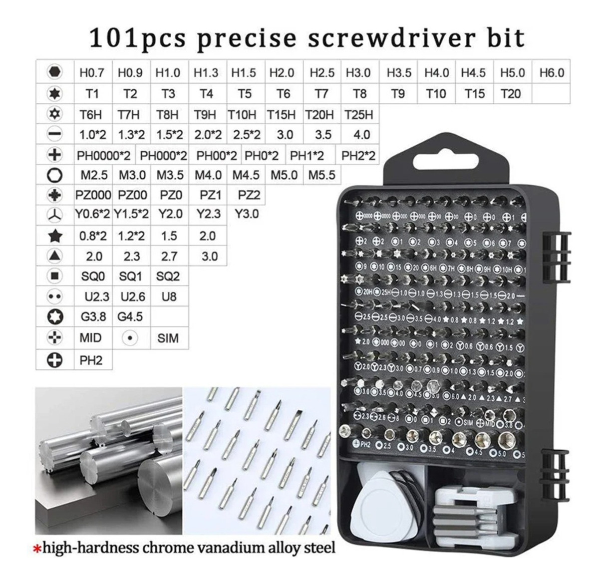 Este pequeño juego de destornilladores de precisión consiste en 98 brocas de destornillador, CR-V hechas de acero (dureza 55HRC) .