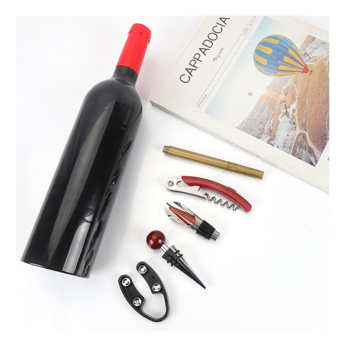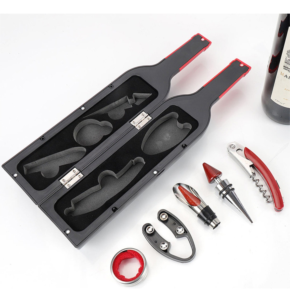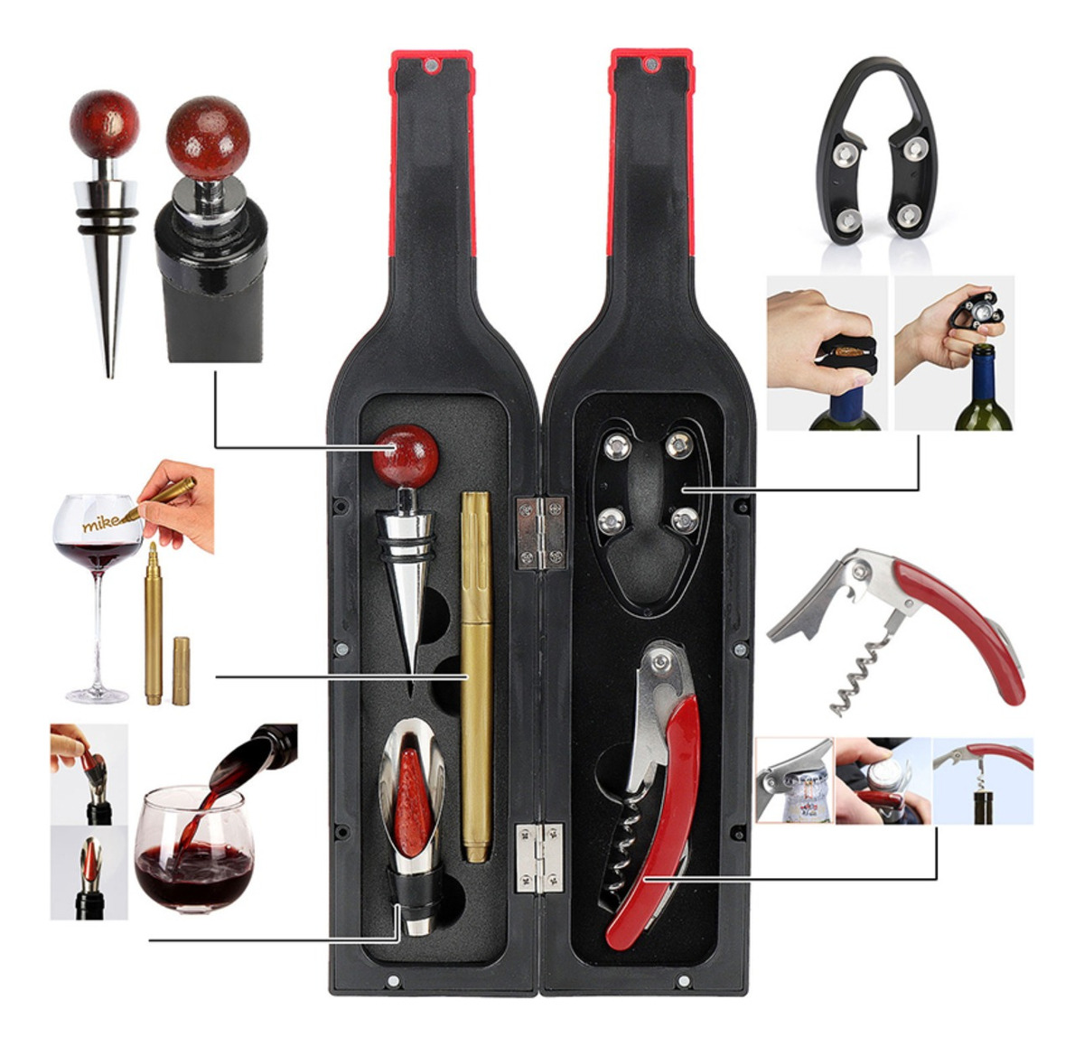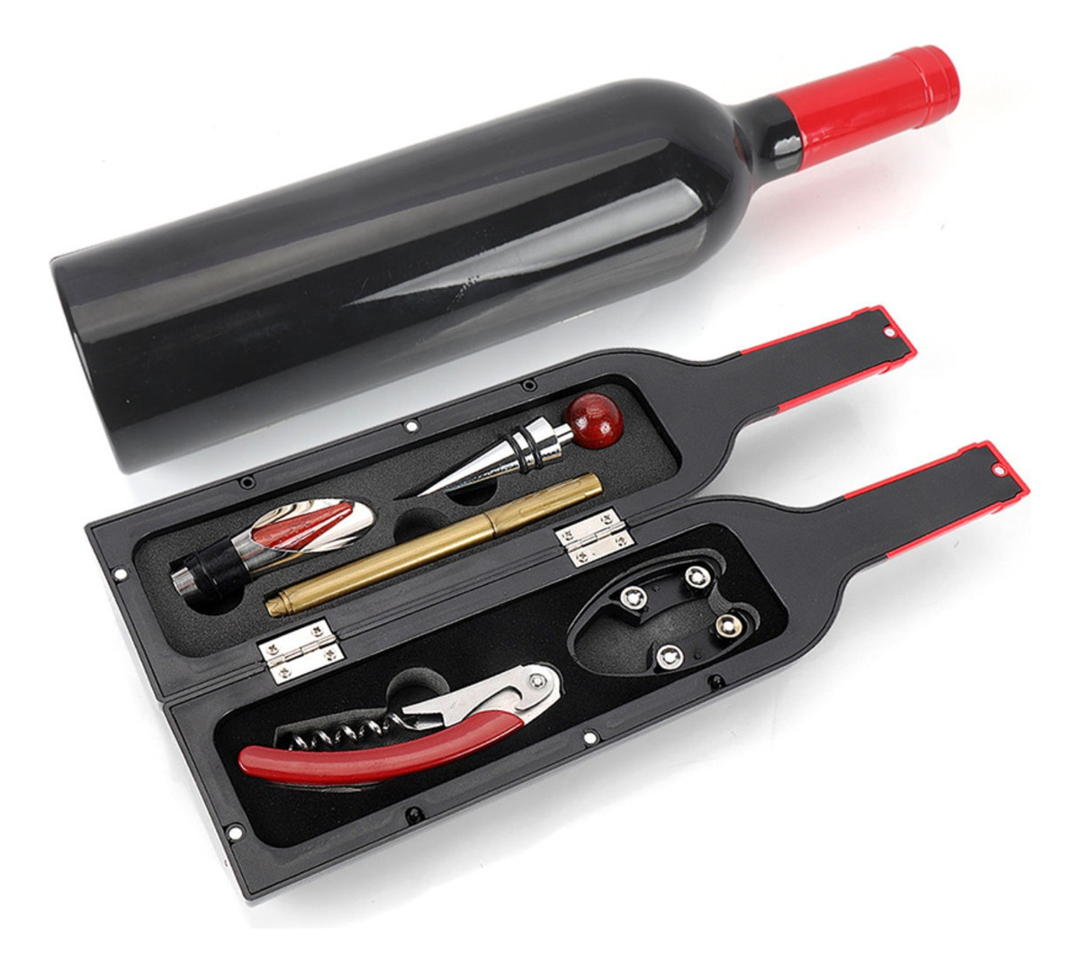 Kit Descorchador Vino Y Accesorios + Organizador Botella
