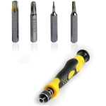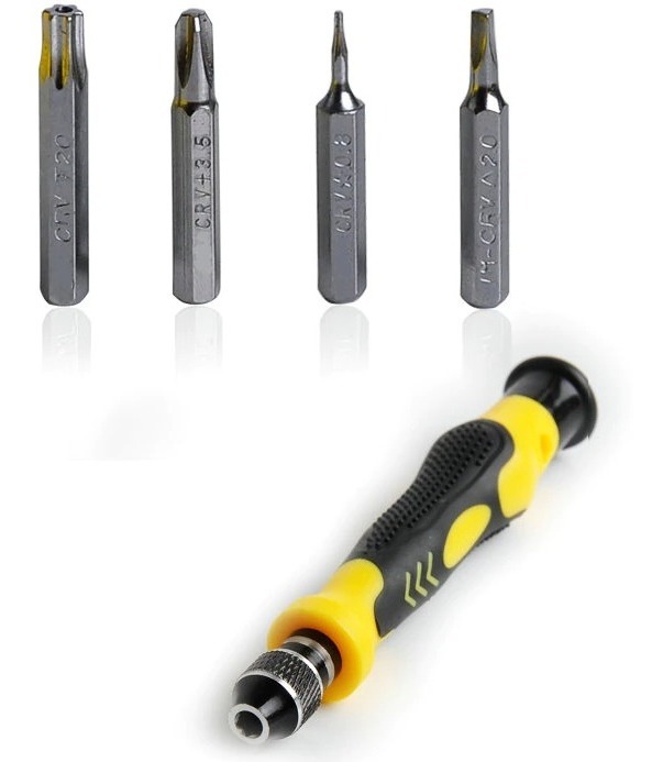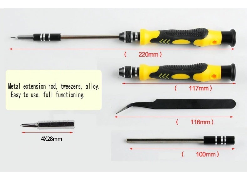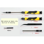 Contiene: 1 pinza 11,8 cm 1 barra de extensión 10cm 1 mango 12cm 7 toma de CRV: M2.5A M3.0A M3.5A M4.0A M4.5A M5.0A M5.5 35 destornilladores: – 10 tornillos Torx conductor: T3A T4A T5A T6A T7A T8A T91A T10A T15A T20 – 8 Tornillos hexagonal conductor: H0.9A H1.3A H1.5A H2.0A H2.5A H3.0A H3.5A H4.0 – 5 destornilladores de tornillos cruzados 1,0, 1,5, 2,0, 2,5, 3,5 – 7 destornilladores rectos: 1,0 de 1,5 de 2,0 de 2,5 de 3,0 de 3,5 de 4,0 – 1 destornilladores triangulares: 2,0 – 1 destornilladores estrellas: 0,8 – 2 destornilladores Y: Y2.0, Y2.5 – 1 destornillador circular: 1,5