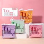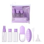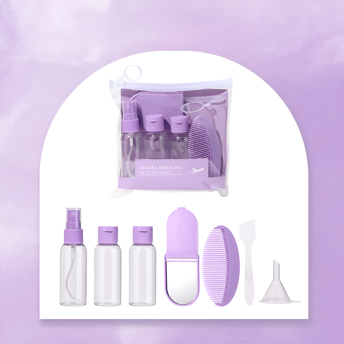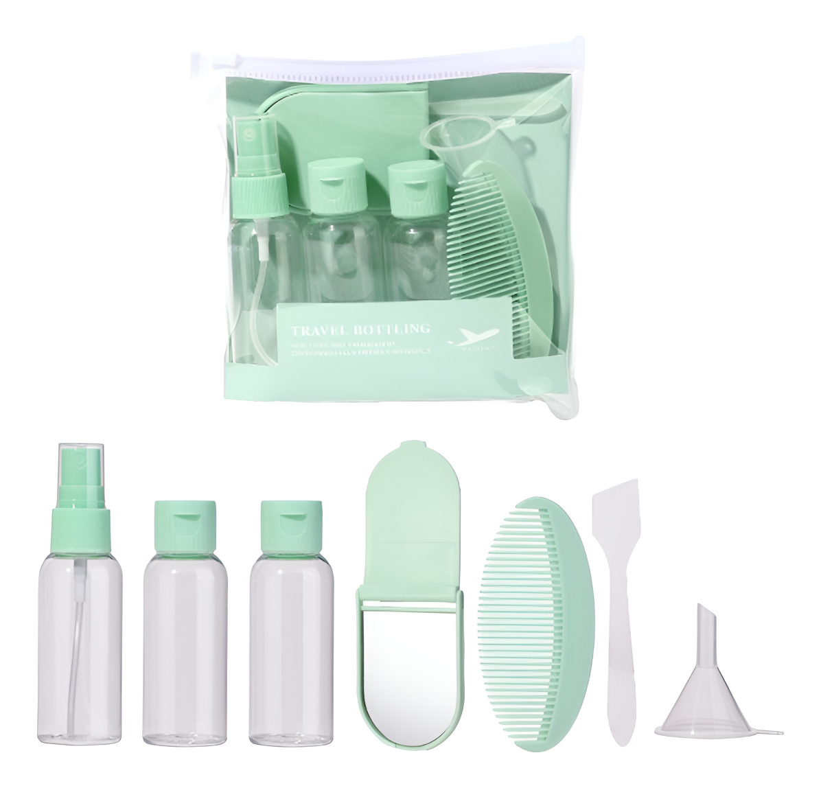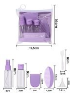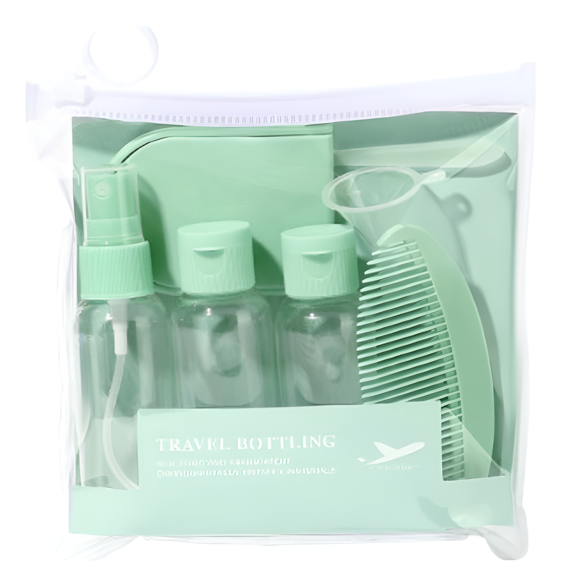 Kit Organizador de Botellas y Frascos Rellenables para Viaje, incluye todo lo necesario para llevar tus productos de cuidado personal de manera práctica y ordenada. Ideal para evitar derrames y facilitar el transporte de tus líquidos y cremas en cualquier viaje. Reutilizable y fácil de usar.