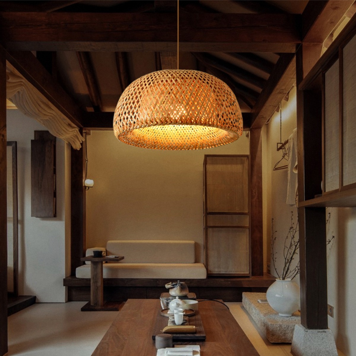 Lámpara colgante nórdica de madera de bambú, tejido a mano.
