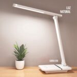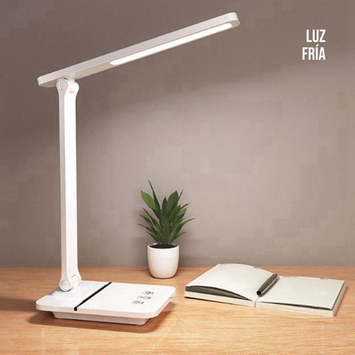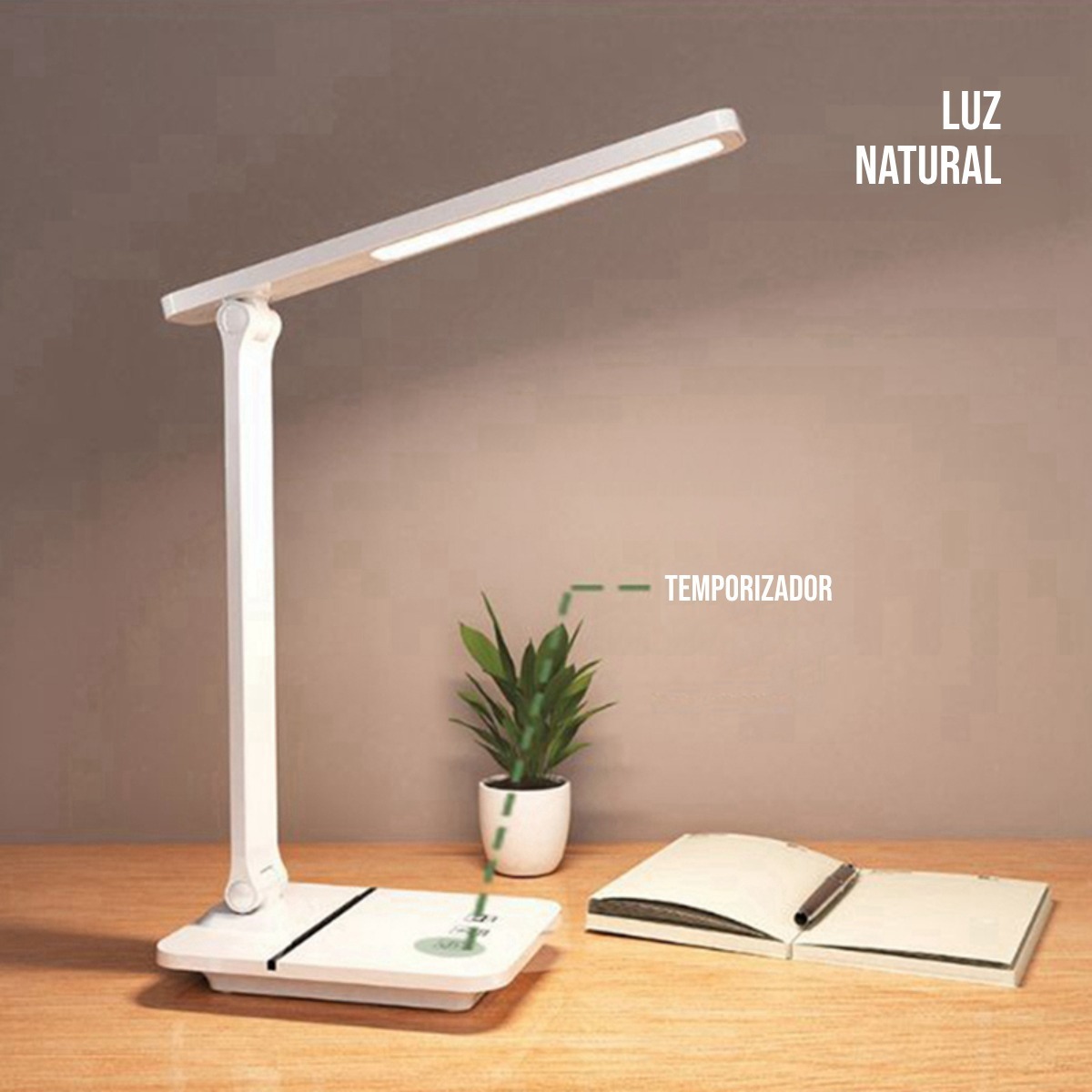 Lámpara recargable para escritorio o mesa de luz. Carga tu lampara mientras cargas tu celular, esta lámpara de escritorio o mesa de luz sirve a su vez de soporte para tu teléfono móvil. Recargable, carga completa en 5 horas, puede utilizarse entre 3 y 6 horas aprox. Con tocar un solo botón podrás ajusta el brillo y la temperaturas de luz, cálida, fría y neutra. Con función temporizador. Perfecta para trabajos de oficina, o para lectura en casa para niños y adultos. Triple protección para la salud ocular.