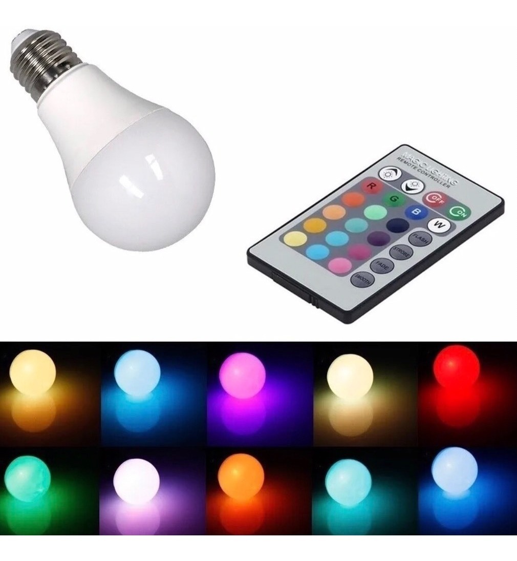 CARACTERISTICAS : Rosca común (E27) como en nuestras casas. Voltaje estandar. Material de Aluminio y Plastico. Total de energía: 5W Tecnología LED (no consume casi nada – incluso mucho mucho menos que las lamparas de bajo consumo convencionales). Vida útil: Entre 40.000 y 50.000 horas. 16 colores manejables con control remoto.